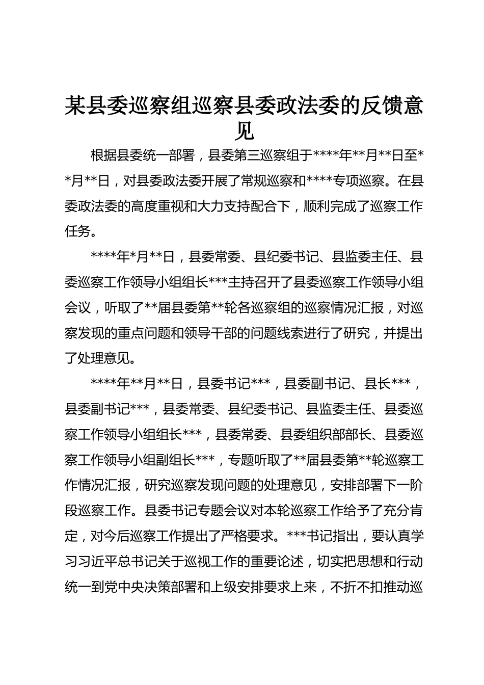 某縣委巡察組巡察縣委政法委的反饋意見根據(jù)縣委統(tǒng)一部署,縣委第三巡察組于****年**月**日至**月**日,對(duì)縣委政法委開展了常規(guī)巡察和****專項(xiàng)巡察。在縣委政法委的高度重視和大力支持配合下,順利完成了巡察工作任務(wù)。****年*月**日,縣委常委、縣紀(jì)委書記、縣監(jiān)委主任、縣委巡察工作領(lǐng)導(dǎo)小組組長(zhǎng)***主持召開了縣委巡察工作領(lǐng)導(dǎo)小組會(huì)議,聽取了**屆縣委第**輪各巡察組的巡察情況匯報(bào),對(duì)巡察發(fā)現(xiàn)的重點(diǎn)問(wèn)題和領(lǐng)導(dǎo)干部的問(wèn)題線索進(jìn)行了研究,并提出了處理意見。****年**月**日,縣委書記***,縣委副書記、縣長(zhǎng)***,縣委副書記***,縣委常委、縣紀(jì)委書記、縣監(jiān)委主任、縣...