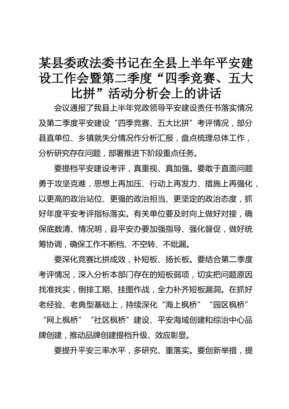 某縣委政法委書記在全縣上半年平安建設(shè)工作會暨第二季度“四季競賽、五大比拼”活動分析會上的講話
