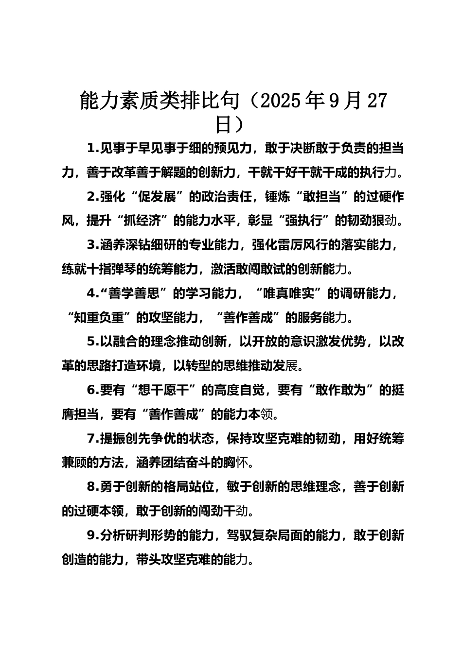 能力素質(zhì)類排比句(2025年9月27日)1.見事于早見事于細的預見力,敢于決斷敢于負責的擔當力,善于改革善于解題的創(chuàng)新力,干就干好干就干成的執(zhí)行力。2.強化“促發(fā)展”的政治責任,錘煉“敢擔當”的過硬作風,提升“抓經(jīng)濟”的能力水平,彰顯“強執(zhí)行”的韌勁狠勁。3.涵養(yǎng)深鉆細研的專業(yè)能力,強化雷厲風行的落實能力,練就十指彈琴的統(tǒng)籌能力,激活敢闖敢試的創(chuàng)新能力。4.“善學善思”的學習能力,“唯真唯實”的調(diào)研能力,“知重負重”的攻堅能力,“善作善成”的服務能力。5.以融合的理念推動創(chuàng)新,以開放的意識激發(fā)優(yōu)勢,以改革的思路打造環(huán)境,以轉(zhuǎn)型的思維推動發(fā)展...