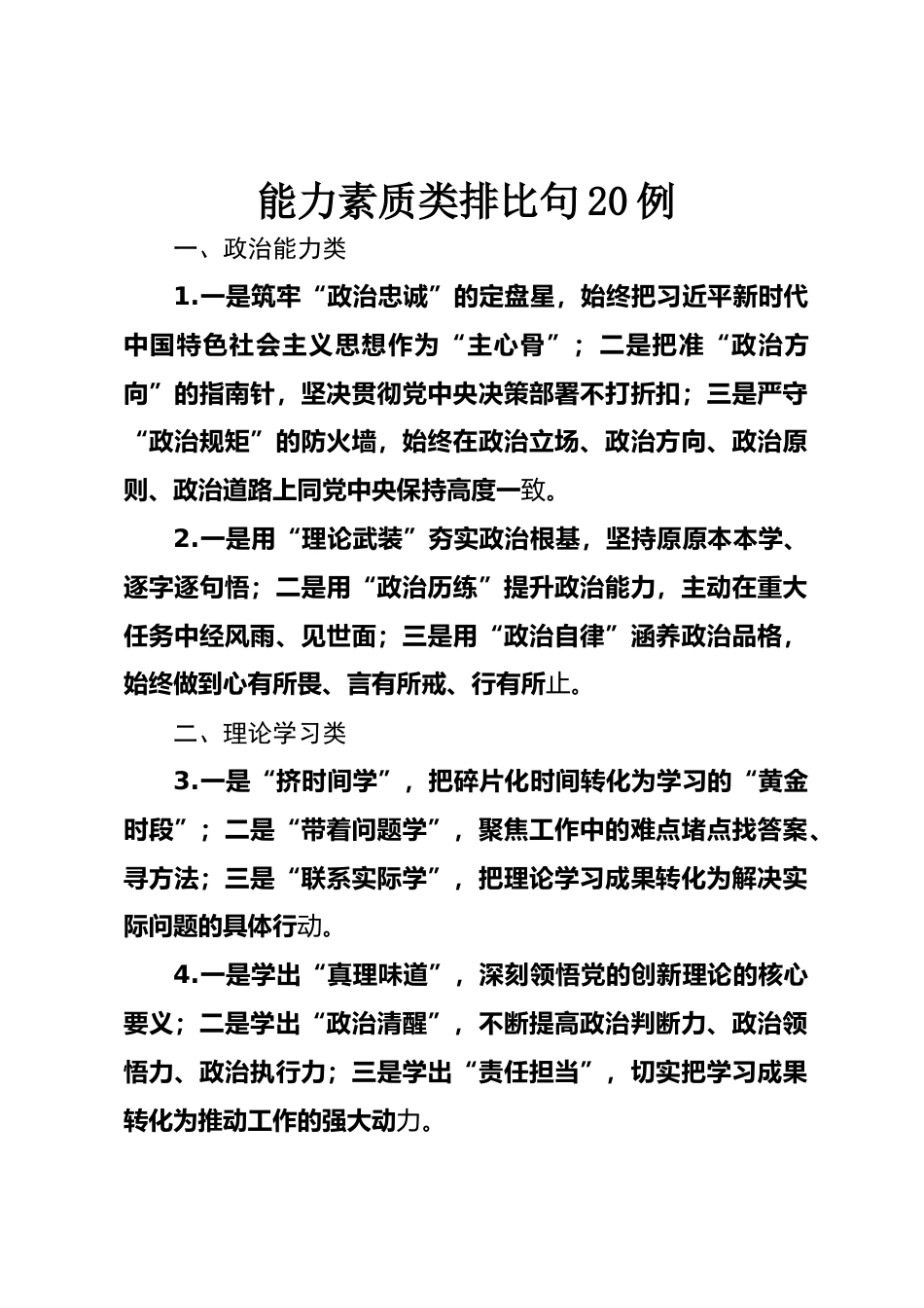 能力素質類排比句20例一、政治能力類1.一是筑牢“政治忠誠”的定盤星,始終把習近平新時代中國特色社會主義思想作為“主心骨”;二是把準“政治方向”的指南針,堅決貫徹黨中央決策部署不打折扣;三是嚴守“政治規(guī)矩”的防火墻,始終在政治立場、政治方向、政治原則、政治道路上同黨中央保持高度一致。2.一是用“理論武裝”夯實政治根基,堅持原原本本學、逐字逐句悟;二是用“政治歷練”提升政治能力,主動在重大任務中經風雨、見世面;三是用“政治自律”涵養(yǎng)政治品格,始終做到心有所畏、言有所戒、行有所止。二、理論學習類3.一是“擠時間學”,把碎片化時間轉化為學...