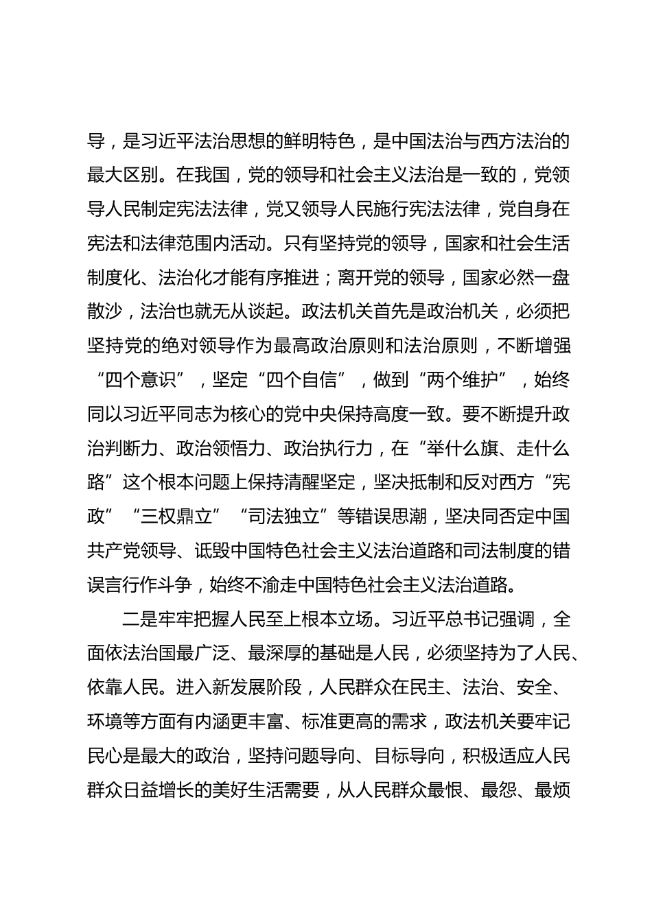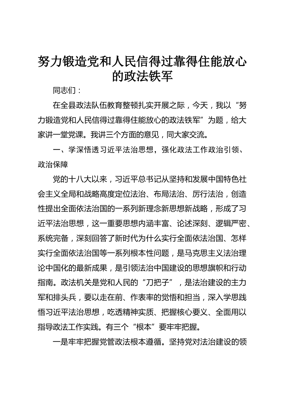 努力鍛造黨和人民信得過靠得住能放心的政法鐵軍同志們:在全縣政法隊伍教育整頓扎實開展之際,今天,我以“努力鍛造黨和人民信得過靠得住能放心的政法鐵軍”為題,給大家講一堂黨課。我講三個方面的意見,同大家交流。一、學(xué)深悟透習(xí)近平法治思想,強化政法工作政治引領(lǐng)、政治保障黨的十八大以來,習(xí)近平總書記從堅持和發(fā)展中國特色社會主義全局和戰(zhàn)略高度定位法治、布局法治、厲行法治,創(chuàng)造性提出全面依法治國的一系列新理念新思想新戰(zhàn)略,形成了習(xí)近平法治思想,這一重要思想內(nèi)涵豐富、論述深刻、邏輯嚴密、系統(tǒng)完備,深刻回答了新時代為什么實行全面依法治國、怎樣實...