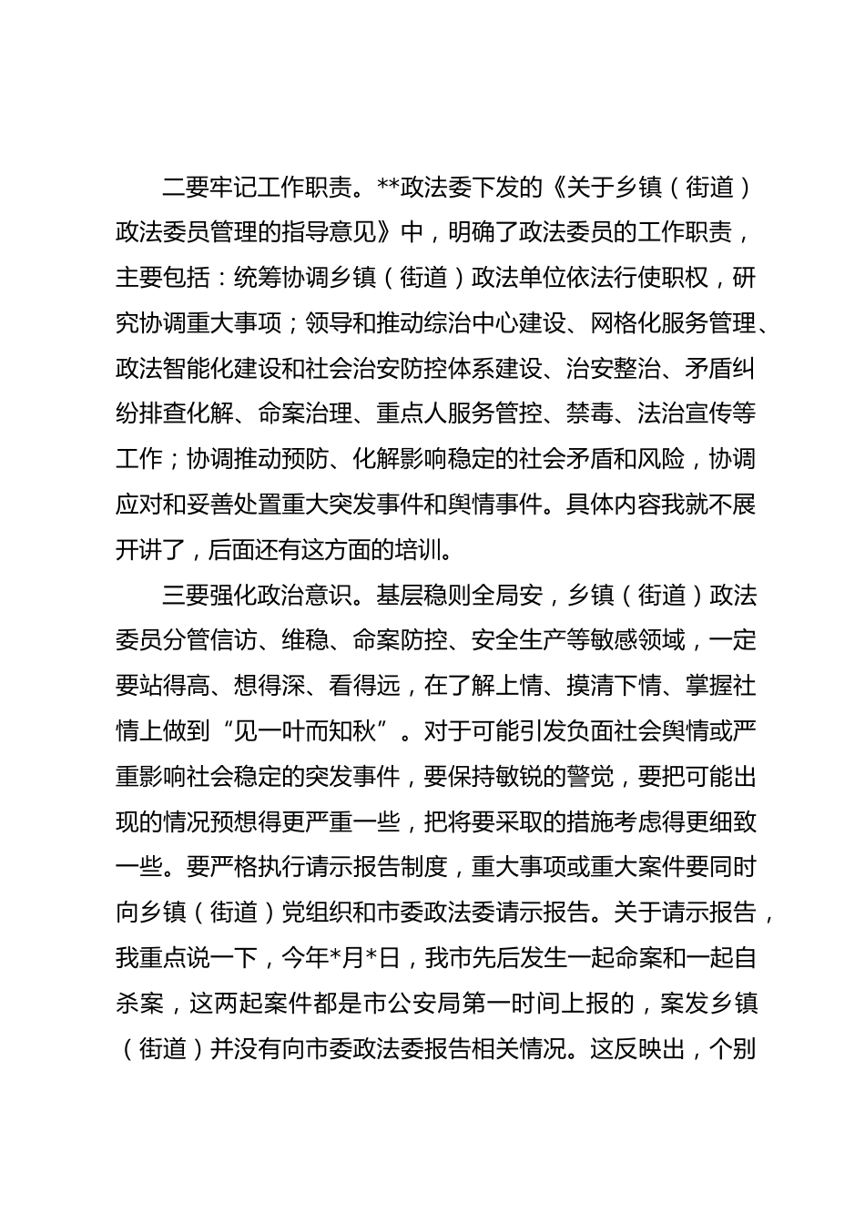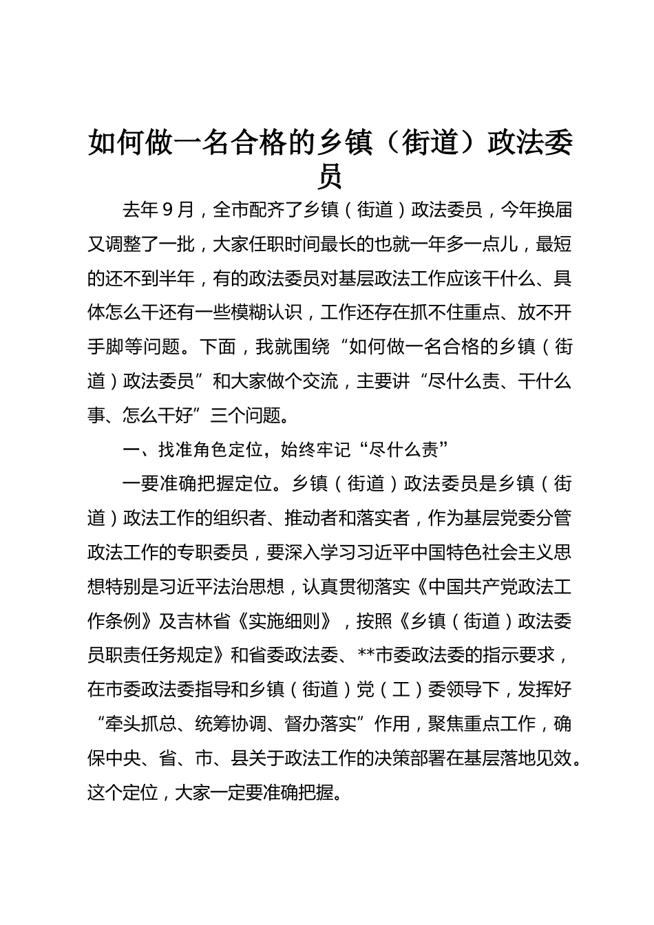 如何做一名合格的鄉(xiāng)鎮(zhèn)(街道)政法委員去年9月,全市配齊了鄉(xiāng)鎮(zhèn)(街道)政法委員,今年換屆又調(diào)整了一批,大家任職時間最長的也就一年多一點兒,最短的還不到半年,有的政法委員對基層政法工作應(yīng)該干什么、具體怎么干還有一些模糊認識,工作還存在抓不住重點、放不開手腳等問題。下面,我就圍繞“如何做一名合格的鄉(xiāng)鎮(zhèn)(街道)政法委員”和大家做個交流,主要講“盡什么責、干什么事、怎么干好”三個問題。一、找準角色定位,始終牢記“盡什么責”一要準確把握定位。鄉(xiāng)鎮(zhèn)(街道)政法委員是鄉(xiāng)鎮(zhèn)(街道)政法工作的組織者、推動者和落實者,作為基層黨委分管政法工作的專...