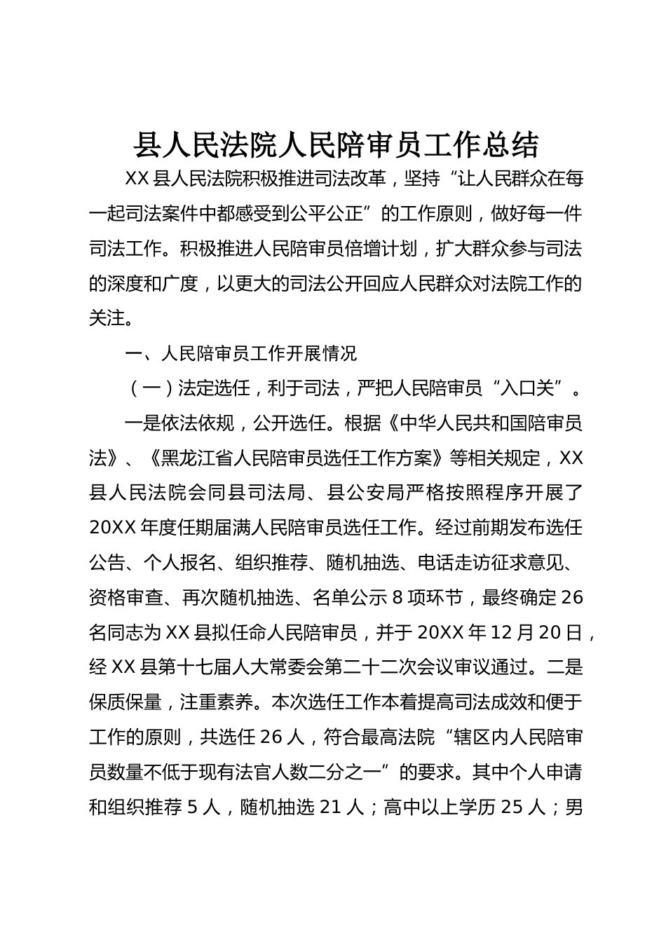 縣人民法院人民陪審員工作總結(jié)XX縣人民法院積極推進(jìn)司法改革,堅(jiān)持“讓人民群眾在每一起司法案件中都感受到公平公正”的工作原則,做好每一件司法工作。積極推進(jìn)人民陪審員倍增計(jì)劃,擴(kuò)大群眾參與司法的深度和廣度,以更大的司法公開(kāi)回應(yīng)人民群眾對(duì)法院工作的關(guān)注。一、人民陪審員工作開(kāi)展情況(一)法定選任,利于司法,嚴(yán)把人民陪審員“入口關(guān)”。一是依法依規(guī),公開(kāi)選任。根據(jù)《中華人民共和國(guó)陪審員法》、《黑龍江省人民陪審員選任工作方案》等相關(guān)規(guī)定,XX縣人民法院會(huì)同縣司法局、縣公安局嚴(yán)格按照程序開(kāi)展了20XX年度任期屆滿人民陪審員選任工作。經(jīng)過(guò)前期發(fā)布選任...
