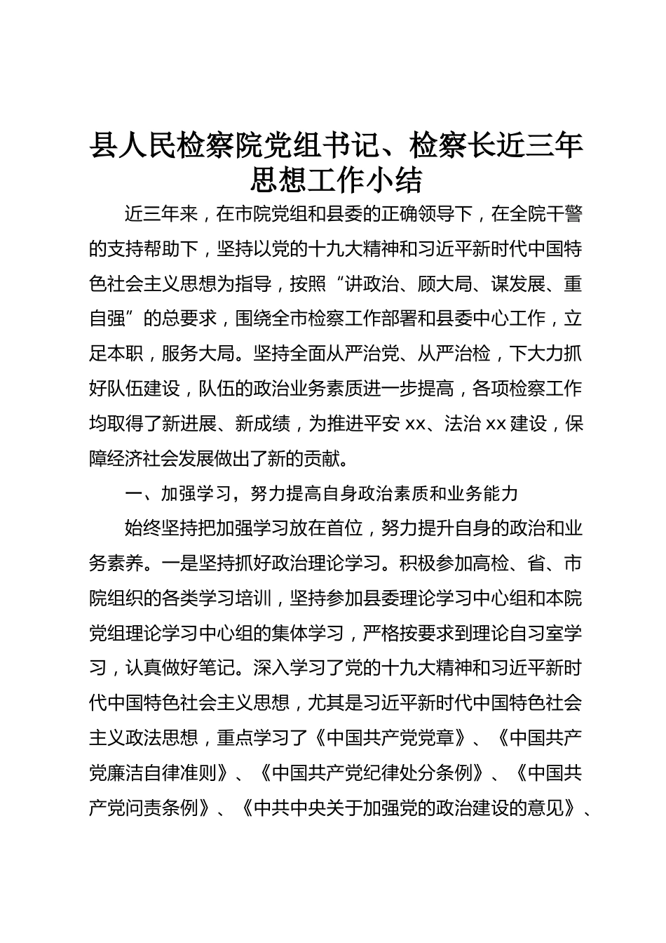 縣人民檢察院黨組書記、檢察長(zhǎng)近三年思想工作小結(jié)近三年來(lái),在市院黨組和縣委的正確領(lǐng)導(dǎo)下,在全院干警的支持幫助下,堅(jiān)持以黨的十九大精神和習(xí)近平新時(shí)代中國(guó)特色社會(huì)主義思想為指導(dǎo),按照“講政治、顧大局、謀發(fā)展、重自強(qiáng)”的總要求,圍繞全市檢察工作部署和縣委中心工作,立足本職,服務(wù)大局。堅(jiān)持全面從嚴(yán)治黨、從嚴(yán)治檢,下大力抓好隊(duì)伍建設(shè),隊(duì)伍的政治業(yè)務(wù)素質(zhì)進(jìn)一步提高,各項(xiàng)檢察工作均取得了新進(jìn)展、新成績(jī),為推進(jìn)平安xx、法治xx建設(shè),保障經(jīng)濟(jì)社會(huì)發(fā)展做出了新的貢獻(xiàn)。一、加強(qiáng)學(xué)習(xí),努力提高自身政治素質(zhì)和業(yè)務(wù)能力始終堅(jiān)持把加強(qiáng)學(xué)習(xí)放在首位,努力提升自...