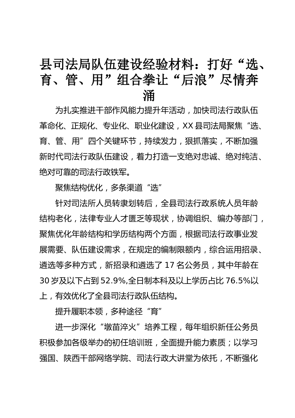 縣司法局隊伍建設(shè)經(jīng)驗材料:打好“選、育、管、用”組合拳讓“后浪”盡情奔涌