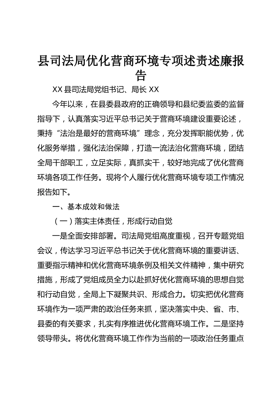 縣司法局優(yōu)化營商環(huán)境專項述責述廉報告XX縣司法局黨組書記、局長XX今年以來,在縣委縣政府的正確領(lǐng)導(dǎo)和縣紀委監(jiān)委的監(jiān)督指導(dǎo)下,認真落實習(xí)近平總書記關(guān)于營商環(huán)境建設(shè)重要論述,秉持“法治是最好的營商環(huán)境”理念,充分發(fā)揮職能優(yōu)勢,優(yōu)化服務(wù)舉措,強化法治保障,打造一流法治化營商環(huán)境,團結(jié)全局干部職工,立足實際,真抓實干,較好地完成了優(yōu)化營商環(huán)境各項工作任務(wù)?,F(xiàn)將個人履行優(yōu)化營商環(huán)境專項工作情況報告如下。一、基本成效和做法(一)落實主體責任,形成行動自覺一是全面安排部署。司法局黨組高度重視,召開專題黨組會議,傳達學(xué)習(xí)習(xí)近平總書記關(guān)于優(yōu)化營商...