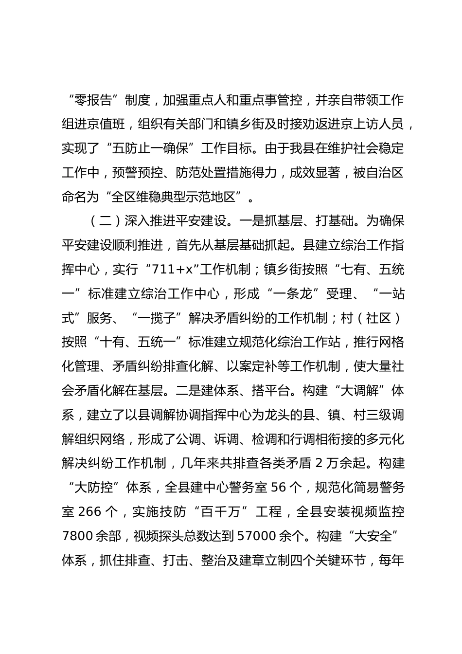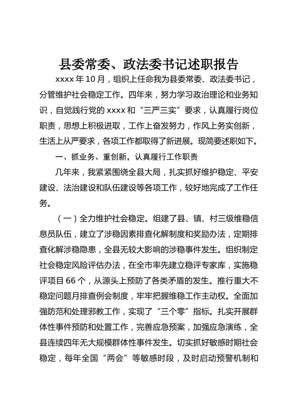 縣委常委、政法委書記述職報告xxxx年10月,組織上任命我為縣委常委、政法委書記,分管維護(hù)社會穩(wěn)定工作。四年來,努力學(xué)習(xí)政治理論和業(yè)務(wù)知識,自覺踐行黨的xxxx和“三嚴(yán)三實”要求,認(rèn)真履行崗位職責(zé),思想上積極進(jìn)取,工作上奮發(fā)努力,作風(fēng)上務(wù)實創(chuàng)新,生活上從嚴(yán)要求,各項工作都取得了新進(jìn)展?,F(xiàn)簡要述職如下。一、抓業(yè)務(wù)、重創(chuàng)新,認(rèn)真履行工作職責(zé)幾年來,我緊緊圍繞全縣大局,扎實抓好維護(hù)穩(wěn)定、平安建設(shè)、法治建設(shè)和隊伍建設(shè)等各項工作,較好地完成了工作任務(wù)。(一)全力維護(hù)社會穩(wěn)定。組建了縣、鎮(zhèn)、村三級維穩(wěn)信息員隊伍,建立了涉穩(wěn)因素排查化解制度和獎勵辦...