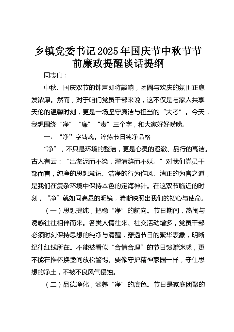鄉(xiāng)鎮(zhèn)黨委書記2025年國慶節(jié)中秋節(jié)節(jié)前廉政提醒談話提綱