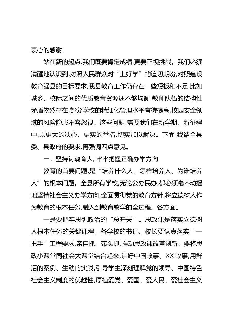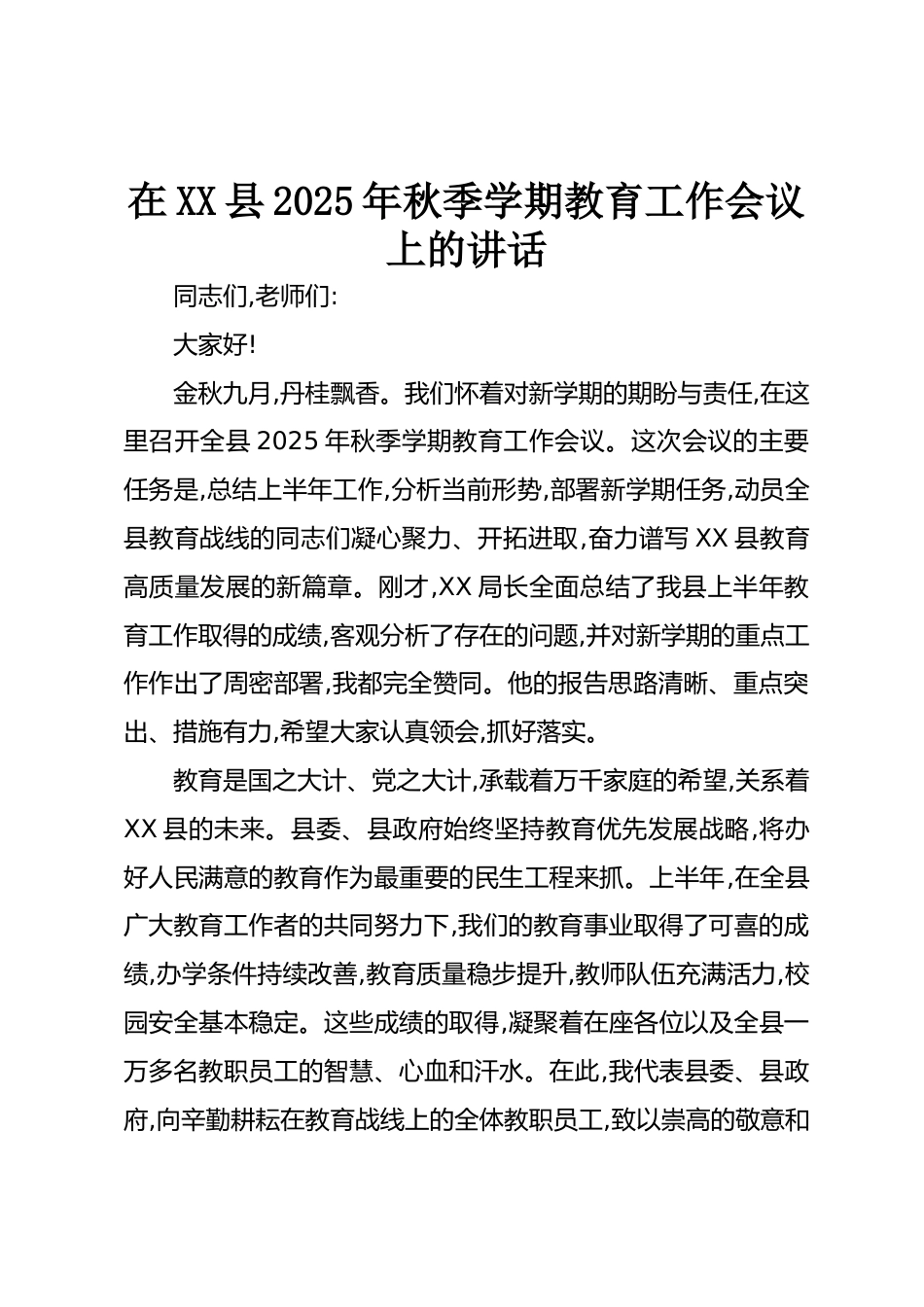在XX縣2025年秋季學(xué)期教育工作會議上的講話同志們,老師們:大家好!金秋九月,丹桂飄香。我們懷著對新學(xué)期的期盼與責(zé)任,在這里召開全縣2025年秋季學(xué)期教育工作會議。這次會議的主要任務(wù)是,總結(jié)上半年工作,分析當(dāng)前形勢,部署新學(xué)期任務(wù),動員全縣教育戰(zhàn)線的同志們凝心聚力、開拓進(jìn)取,奮力譜寫XX縣教育高質(zhì)量發(fā)展的新篇章。剛才,XX局長全面總結(jié)了我縣上半年教育工作取得的成績,客觀分析了存在的問題,并對新學(xué)期的重點(diǎn)工作作出了周密部署,我都完全贊同。他的報(bào)告思路清晰、重點(diǎn)突出、措施有力,希望大家認(rèn)真領(lǐng)會,抓好落實(shí)。教育是國之大計(jì)、黨之大計(jì),承載著萬千家庭的希望,關(guān)系著...