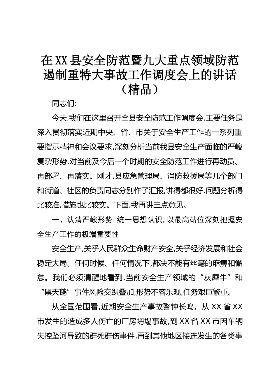 在XX縣安全防范暨九大重點(diǎn)領(lǐng)域防范遏制重特大事故工作調(diào)度會(huì)上的講話(精品)