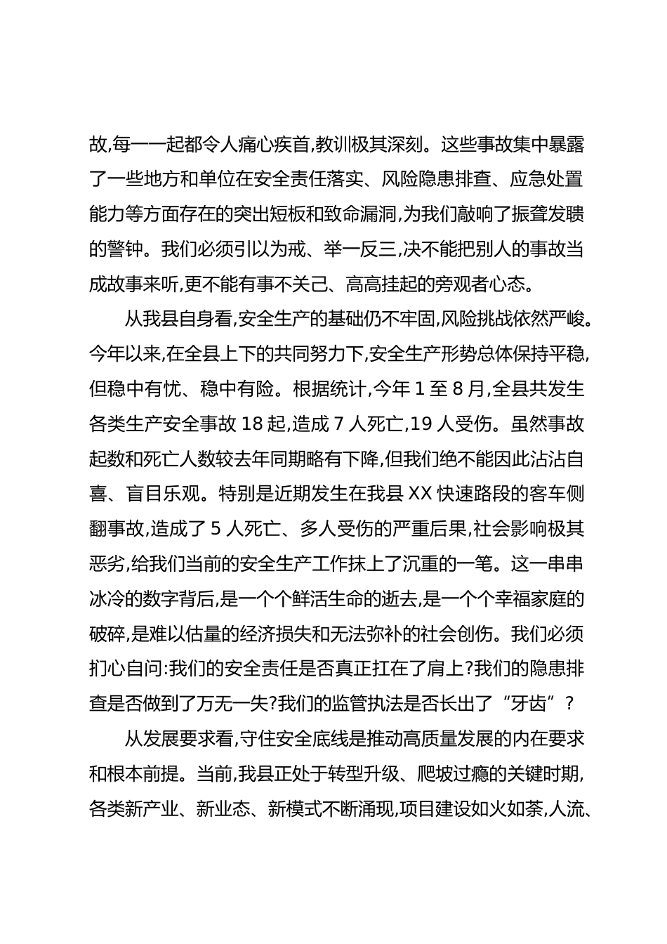 在XX縣安全防范暨九大重點(diǎn)領(lǐng)域防范遏制重特大事故工作調(diào)度會(huì)上的講話(精品)同志們:今天,我們?cè)谶@里召開(kāi)全縣安全防范工作調(diào)度會(huì),主要任務(wù)是深入貫徹落實(shí)近期中央、省、市關(guān)于安全生產(chǎn)工作的一系列重要指示精神和會(huì)議要求,深刻分析當(dāng)前我縣安全生產(chǎn)面臨的嚴(yán)峻復(fù)雜形勢(shì),對(duì)當(dāng)前及今后一個(gè)時(shí)期的安全防范工作進(jìn)行再動(dòng)員、再部署、再落實(shí)。剛才,縣應(yīng)急管理局、消防救援局等幾個(gè)部門和街道、社區(qū)的負(fù)責(zé)同志分別作了匯報(bào),講得都很好,問(wèn)題分析得比較準(zhǔn),措施也比較實(shí)。下面,我再講三點(diǎn)意見(jiàn)。一、認(rèn)清嚴(yán)峻形勢(shì),統(tǒng)一思想認(rèn)識(shí),以最高站位深刻把握安全生產(chǎn)工作的極端重要性安全生產(chǎn),...