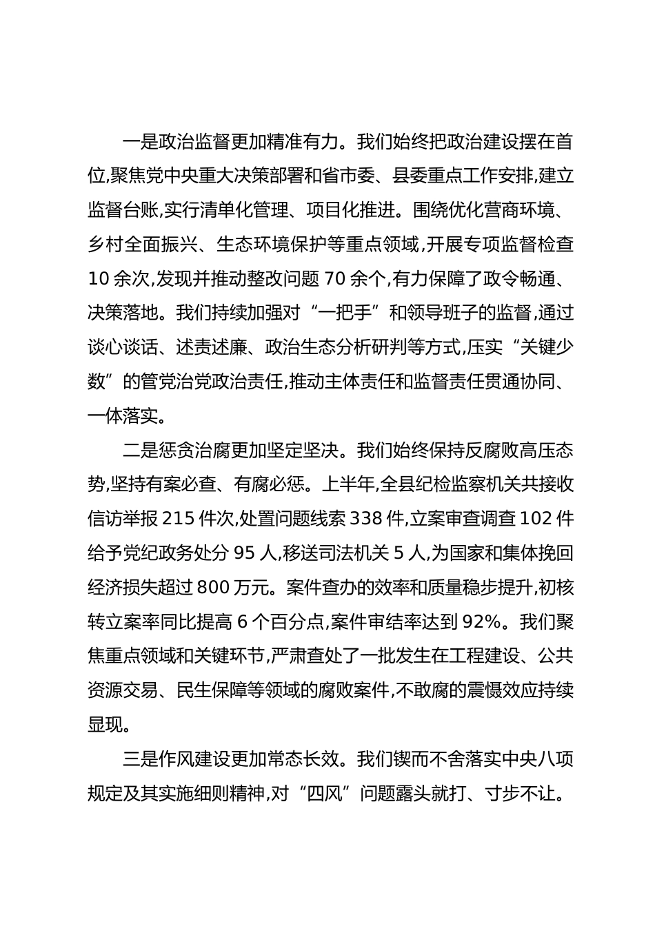 在XX縣紀(jì)委監(jiān)委上半年工作總結(jié)暨集中整治推進(jìn)會(huì)議上的講話(精品)同志們:今天,我們?cè)谶@里召開(kāi)全縣紀(jì)檢監(jiān)察系統(tǒng)半年工作總結(jié)暨集中整治推進(jìn)會(huì)議,主要任務(wù)是深入學(xué)習(xí)貫徹習(xí)近平總書(shū)記關(guān)于黨的自我革命重要思想,全面總結(jié)上半年工作,客觀分析當(dāng)前我縣黨風(fēng)廉政建設(shè)和反腐敗斗爭(zhēng)面臨的形勢(shì)與挑戰(zhàn),并對(duì)下半年的重點(diǎn)任務(wù),特別是正在深入推進(jìn)的集中整治工作,進(jìn)行再動(dòng)員、再部署、再加壓。剛才,幾個(gè)室(部、辦)和派駐紀(jì)檢監(jiān)察組的負(fù)責(zé)同志作了很好的交流發(fā)言,分享了經(jīng)驗(yàn),也剖析了問(wèn)題;會(huì)議還通報(bào)了上半年全委信訪舉報(bào)辦理、集中整治開(kāi)展以及“室組地”聯(lián)動(dòng)監(jiān)督的工作質(zhì)效考核情況,...