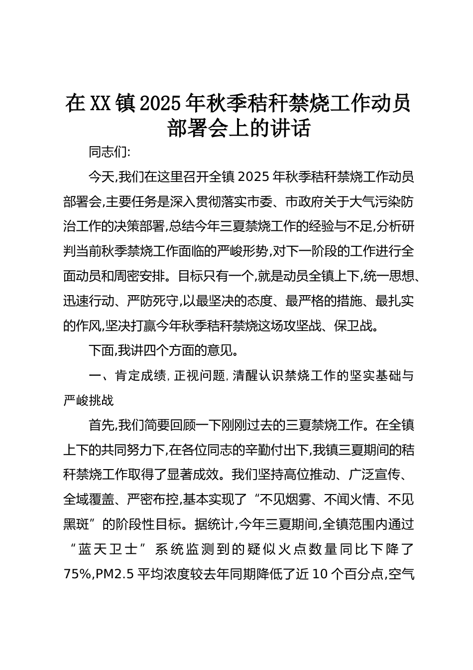 在XX鎮(zhèn)2025年秋季秸稈禁燒工作動員部署會上的講話同志們:今天,我們在這里召開全鎮(zhèn)2025年秋季秸稈禁燒工作動員部署會,主要任務(wù)是深入貫徹落實市委、市政府關(guān)于大氣污染防治工作的決策部署,總結(jié)今年三夏禁燒工作的經(jīng)驗與不足,分析研判當(dāng)前秋季禁燒工作面臨的嚴峻形勢,對下一階段的工作進行全面動員和周密安排。目標(biāo)只有一個,就是動員全鎮(zhèn)上下,統(tǒng)一思想、迅速行動、嚴防死守,以最堅決的態(tài)度、最嚴格的措施、最扎實的作風(fēng),堅決打贏今年秋季秸稈禁燒這場攻堅戰(zhàn)、保衛(wèi)戰(zhàn)。下面,我講四個方面的意見。一、肯定成績,正視問題,清醒認識禁燒工作的堅實基礎(chǔ)與嚴峻挑戰(zhàn)首先,我們簡要回...