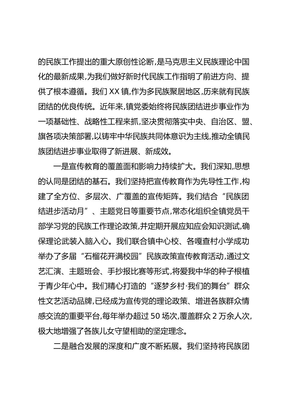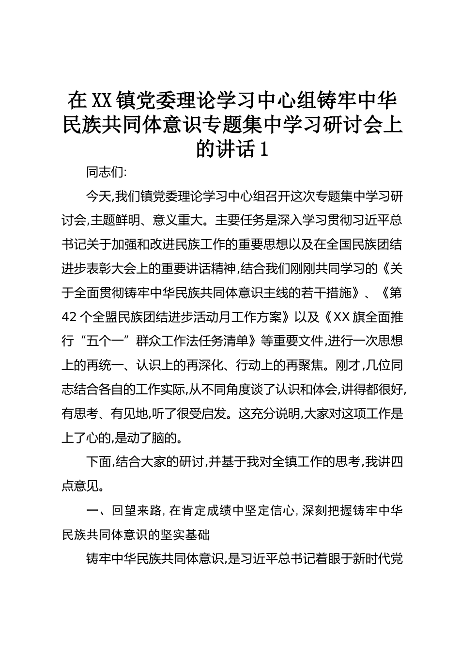 在XX鎮(zhèn)黨委理論學(xué)習(xí)中心組鑄牢中華民族共同體意識專題集中學(xué)習(xí)研討會上的講話1同志們:今天,我們鎮(zhèn)黨委理論學(xué)習(xí)中心組召開這次專題集中學(xué)習(xí)研討會,主題鮮明、意義重大。主要任務(wù)是深入學(xué)習(xí)貫徹習(xí)近平總書記關(guān)于加強(qiáng)和改進(jìn)民族工作的重要思想以及在全國民族團(tuán)結(jié)進(jìn)步表彰大會上的重要講話精神,結(jié)合我們剛剛共同學(xué)習(xí)的《關(guān)于全面貫徹鑄牢中華民族共同體意識主線的若干措施》、《第42個全盟民族團(tuán)結(jié)進(jìn)步活動月工作方案》以及《XX旗全面推行“五個一”群眾工作法任務(wù)清單》等重要文件,進(jìn)行一次思想上的再統(tǒng)一、認(rèn)識上的再深化、行動上的再聚焦。剛才,幾位同志結(jié)合各自的工作實(shí)...