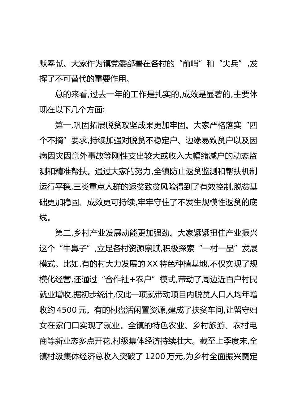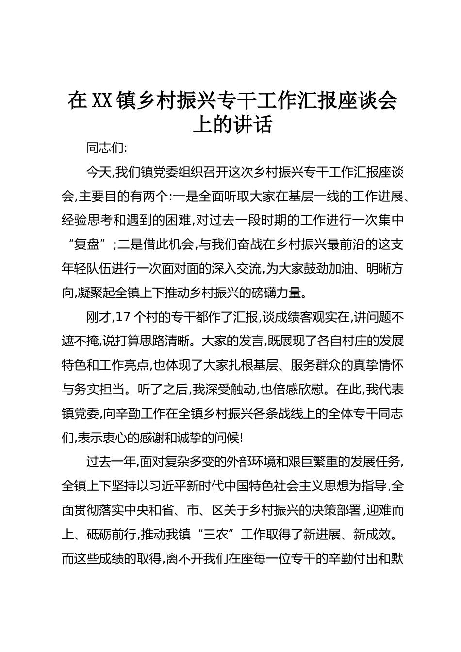 在XX鎮(zhèn)鄉(xiāng)村振興專干工作匯報(bào)座談會(huì)上的講話同志們:今天,我們鎮(zhèn)黨委組織召開(kāi)這次鄉(xiāng)村振興專干工作匯報(bào)座談會(huì),主要目的有兩個(gè):一是全面聽(tīng)取大家在基層一線的工作進(jìn)展、經(jīng)驗(yàn)思考和遇到的困難,對(duì)過(guò)去一段時(shí)期的工作進(jìn)行一次集中“復(fù)盤(pán)”;二是借此機(jī)會(huì),與我們奮戰(zhàn)在鄉(xiāng)村振興最前沿的這支年輕隊(duì)伍進(jìn)行一次面對(duì)面的深入交流,為大家鼓勁加油、明晰方向,凝聚起全鎮(zhèn)上下推動(dòng)鄉(xiāng)村振興的磅礴力量。剛才,17個(gè)村的專干都作了匯報(bào),談成績(jī)客觀實(shí)在,講問(wèn)題不遮不掩,說(shuō)打算思路清晰。大家的發(fā)言,既展現(xiàn)了各自村莊的發(fā)展特色和工作亮點(diǎn),也體現(xiàn)了大家扎根基層、服務(wù)群眾的真摯情懷與務(wù)實(shí)擔(dān)當(dāng)...