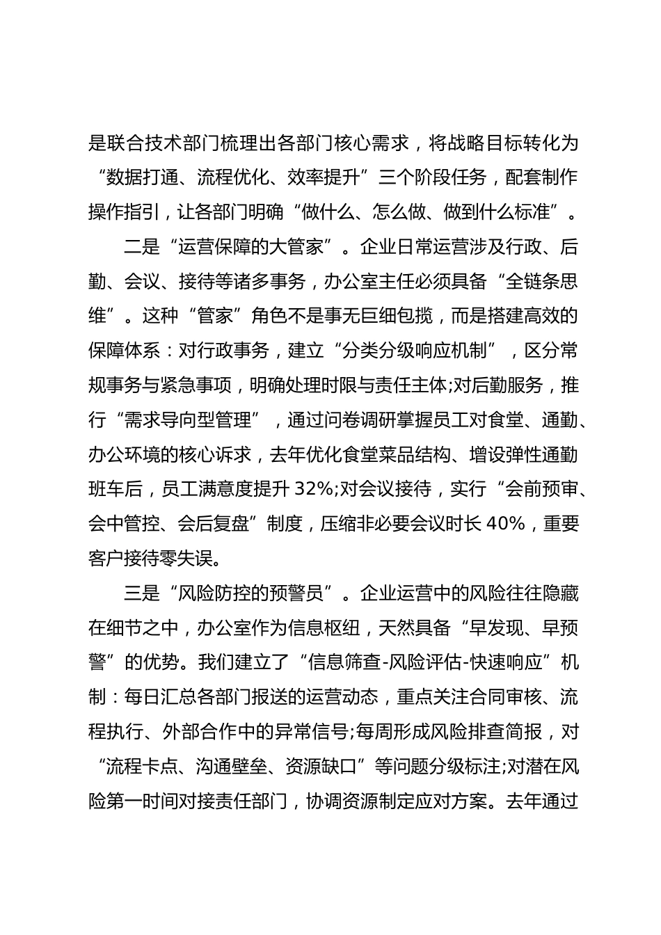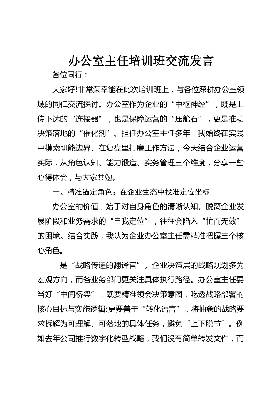 辦公室主任培訓班交流發(fā)言各位同行:大家好!非常榮幸能在此次培訓班上,與各位深耕辦公室領域的同仁交流探討。辦公室作為企業(yè)的“中樞神經(jīng)”,既是上傳下達的“連接器”,也是保障運營的“壓艙石”,更是推動決策落地的“催化劑”。擔任辦公室主任多年,我始終在實踐中摸索職能邊界、在復盤里打磨工作方法,今天結合企業(yè)運營實際,從角色認知、能力鍛造、實務管理三個維度,分享一些心得體會,與大家共勉。一、精準錨定角色:在企業(yè)生態(tài)中找準定位坐標辦公室的價值,始于對自身角色的清晰認知。脫離企業(yè)發(fā)展階段和業(yè)務需求的“自我定位”,往往會陷入“忙而無效”的困境...