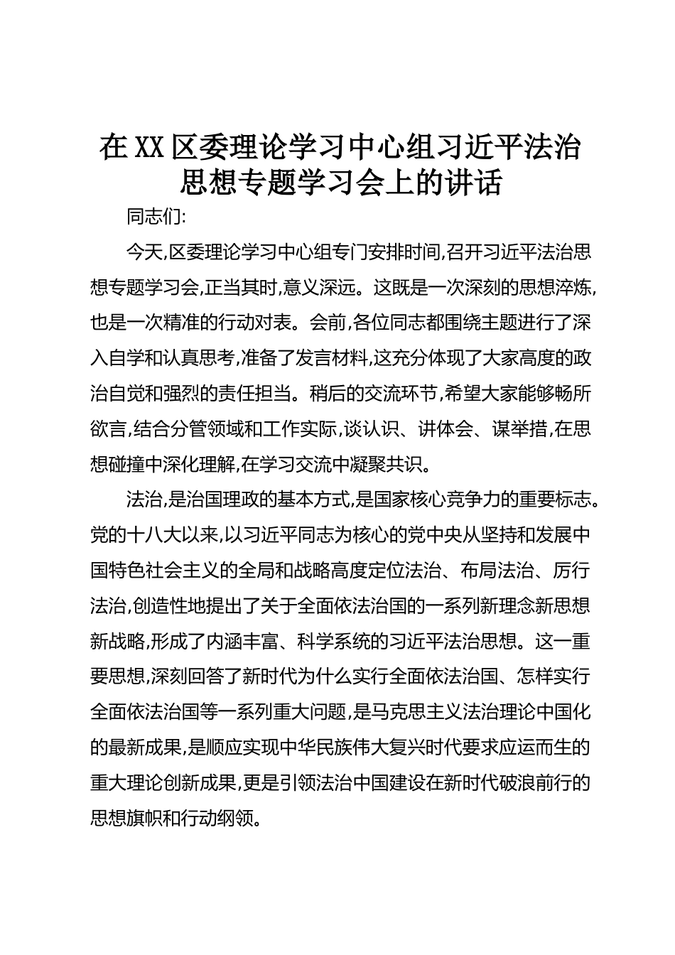 在XX區(qū)委理論學(xué)習(xí)中心組習(xí)近平法治思想專題學(xué)習(xí)會(huì)上的講話同志們:今天,區(qū)委理論學(xué)習(xí)中心組專門安排時(shí)間,召開(kāi)習(xí)近平法治思想專題學(xué)習(xí)會(huì),正當(dāng)其時(shí),意義深遠(yuǎn)。這既是一次深刻的思想淬煉,也是一次精準(zhǔn)的行動(dòng)對(duì)表。會(huì)前,各位同志都圍繞主題進(jìn)行了深入自學(xué)和認(rèn)真思考,準(zhǔn)備了發(fā)言材料,這充分體現(xiàn)了大家高度的政治自覺(jué)和強(qiáng)烈的責(zé)任擔(dān)當(dāng)。稍后的交流環(huán)節(jié),希望大家能夠暢所欲言,結(jié)合分管領(lǐng)域和工作實(shí)際,談?wù)J識(shí)、講體會(huì)、謀舉措,在思想碰撞中深化理解,在學(xué)習(xí)交流中凝聚共識(shí)。法治,是治國(guó)理政的基本方式,是國(guó)家核心競(jìng)爭(zhēng)力的重要標(biāo)志。黨的十八大以來(lái),以習(xí)近平同志為核心的黨中央從堅(jiān)...
