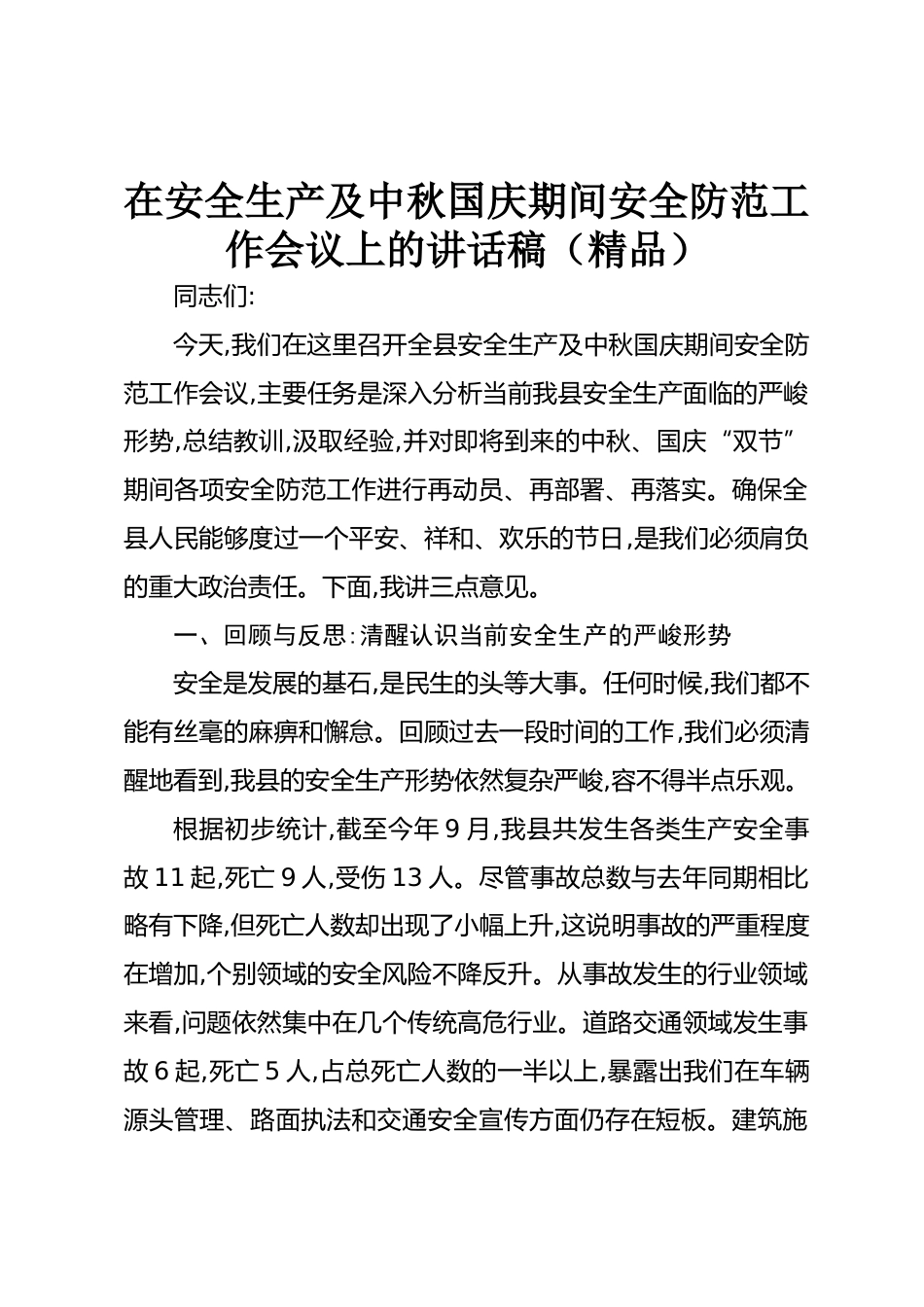 在安全生產(chǎn)及中秋國(guó)慶期間安全防范工作會(huì)議上的講話(huà)稿(精品)
