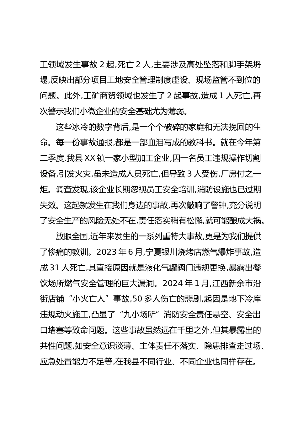 在安全生產(chǎn)及中秋國(guó)慶期間安全防范工作會(huì)議上的講話(huà)稿(精品)同志們:今天,我們?cè)谶@里召開(kāi)全縣安全生產(chǎn)及中秋國(guó)慶期間安全防范工作會(huì)議,主要任務(wù)是深入分析當(dāng)前我縣安全生產(chǎn)面臨的嚴(yán)峻形勢(shì),總結(jié)教訓(xùn),汲取經(jīng)驗(yàn),并對(duì)即將到來(lái)的中秋、國(guó)慶“雙節(jié)”期間各項(xiàng)安全防范工作進(jìn)行再動(dòng)員、再部署、再落實(shí)。確保全縣人民能夠度過(guò)一個(gè)平安、祥和、歡樂(lè)的節(jié)日,是我們必須肩負(fù)的重大政治責(zé)任。下面,我講三點(diǎn)意見(jiàn)。一、回顧與反思:清醒認(rèn)識(shí)當(dāng)前安全生產(chǎn)的嚴(yán)峻形勢(shì)安全是發(fā)展的基石,是民生的頭等大事。任何時(shí)候,我們都不能有絲毫的麻痹和懈怠?;仡欉^(guò)去一段時(shí)間的工作,我們必須清醒地看到...