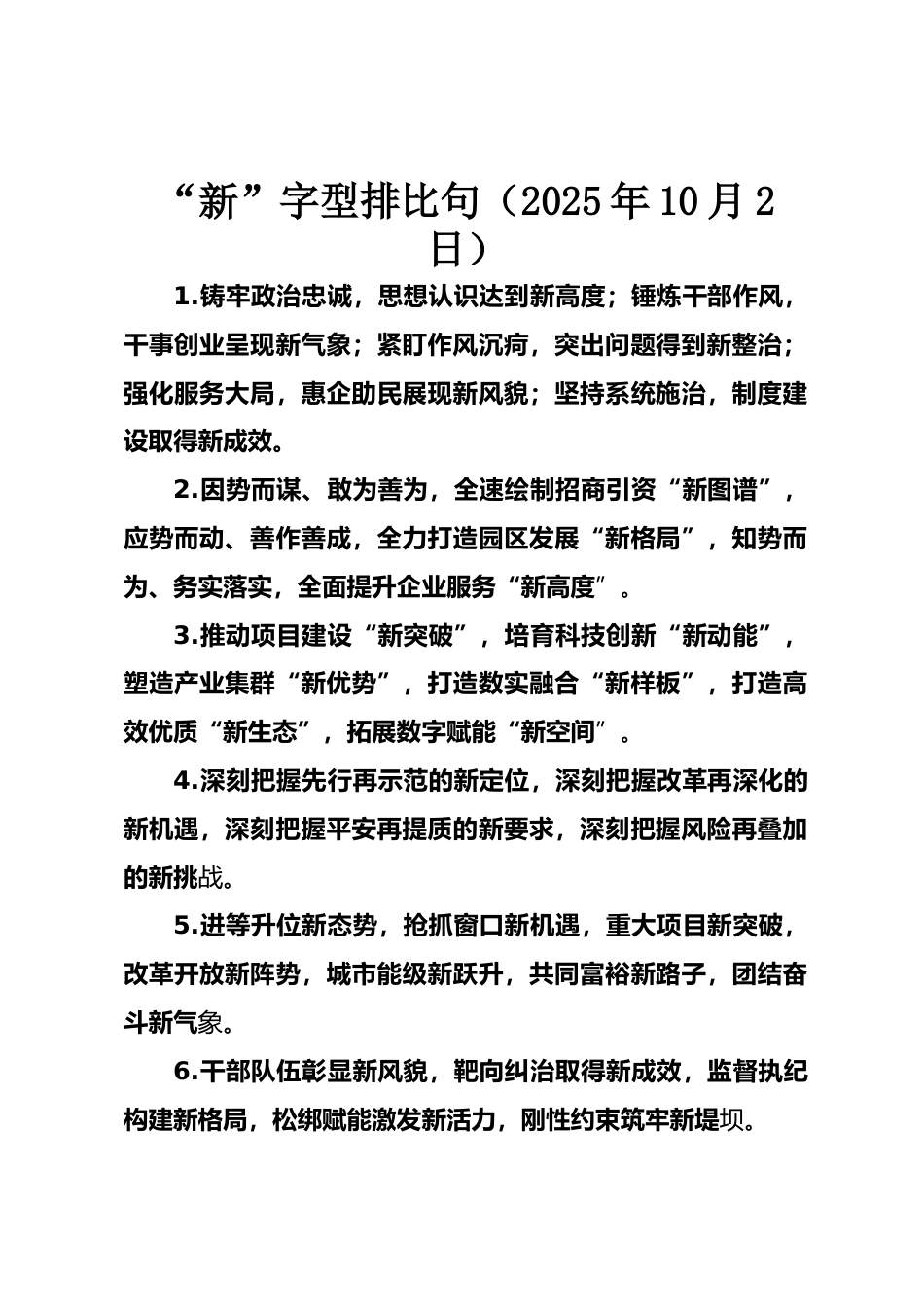 “新”字型排比句(2025年10月2日)1.鑄牢政治忠誠,思想認識達到新高度;錘煉干部作風(fēng),干事創(chuàng)業(yè)呈現(xiàn)新氣象;緊盯作風(fēng)沉疴,突出問題得到新整治;強化服務(wù)大局,惠企助民展現(xiàn)新風(fēng)貌;堅持系統(tǒng)施治,制度建設(shè)取得新成效。2.因勢而謀、敢為善為,全速繪制招商引資“新圖譜”,應(yīng)勢而動、善作善成,全力打造園區(qū)發(fā)展“新格局”,知勢而為、務(wù)實落實,全面提升企業(yè)服務(wù)“新高度”。3.推動項目建設(shè)“新突破”,培育科技創(chuàng)新“新動能”,塑造產(chǎn)業(yè)集群“新優(yōu)勢”,打造數(shù)實融合“新樣板”,打造高效優(yōu)質(zhì)“新生態(tài)”,拓展數(shù)字賦能“新空間”。4.深刻把握先行再示范的新定位,深...