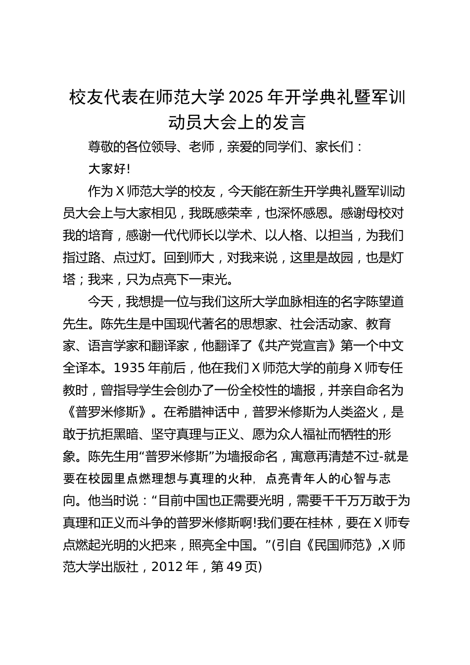校友代表在師范大學(xué)2025年開學(xué)典禮暨軍訓(xùn)動員大會上的發(fā)言尊敬的各位領(lǐng)導(dǎo)、老師,親愛的同學(xué)們、家長們:大家好!作為X師范大學(xué)的校友,今天能在新生開學(xué)典禮暨軍訓(xùn)動員大會上與大家相見,我既感榮幸,也深懷感恩。感謝母校對我的培育,感謝一代代師長以學(xué)術(shù)、以人格、以擔(dān)當(dāng),為我們指過路、點過燈。回到師大,對我來說,這里是故園,也是燈塔;我來,只為點亮下一束光。今天,我想提一位與我們這所大學(xué)血脈相連的名字陳望道先生。陳先生是中國現(xiàn)代著名的思想家、社會活動家、教育家、語言學(xué)家和翻譯家,他翻譯了《共產(chǎn)黨宣言》第一個中文全譯本。1935年前后,他在我們X...