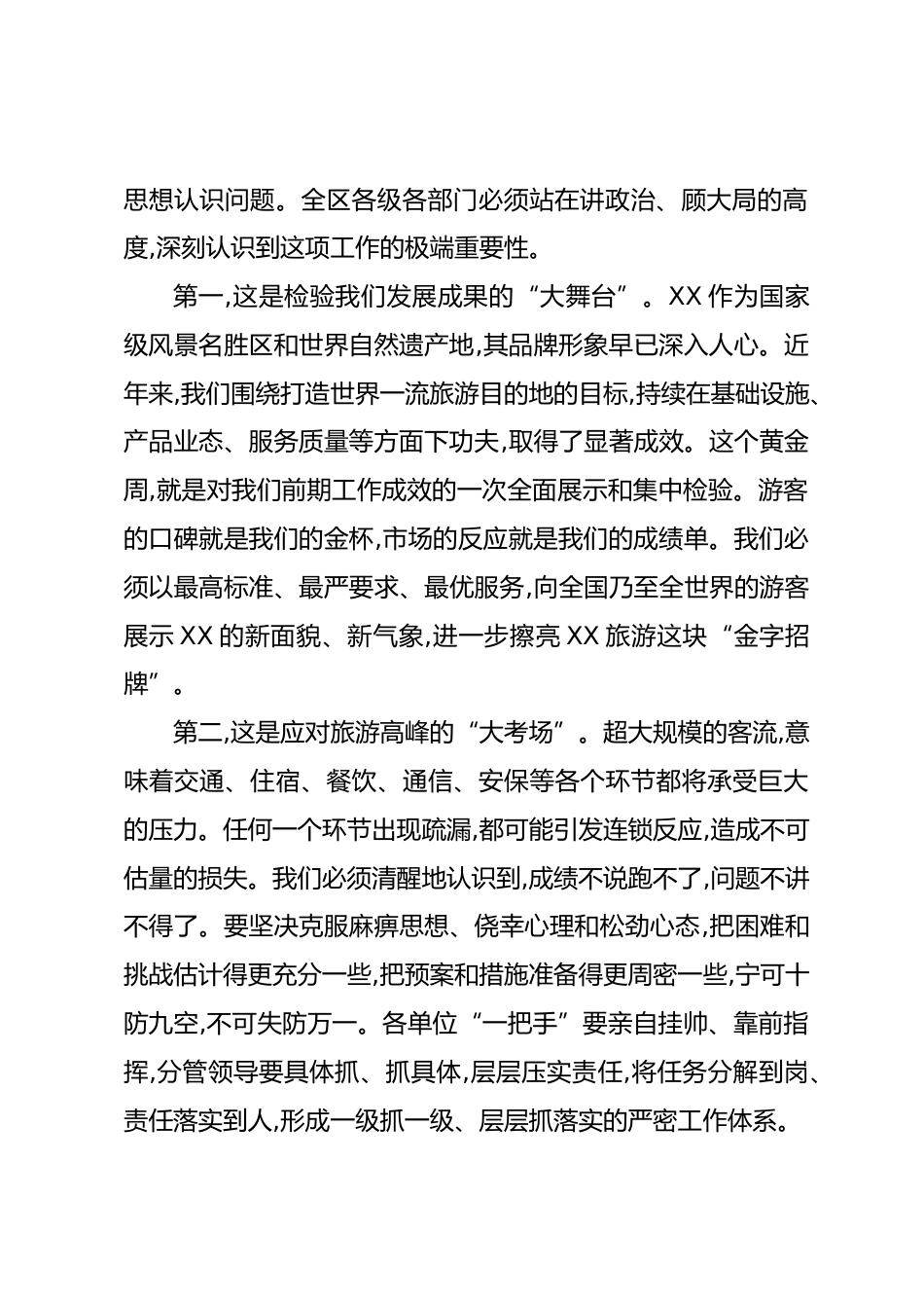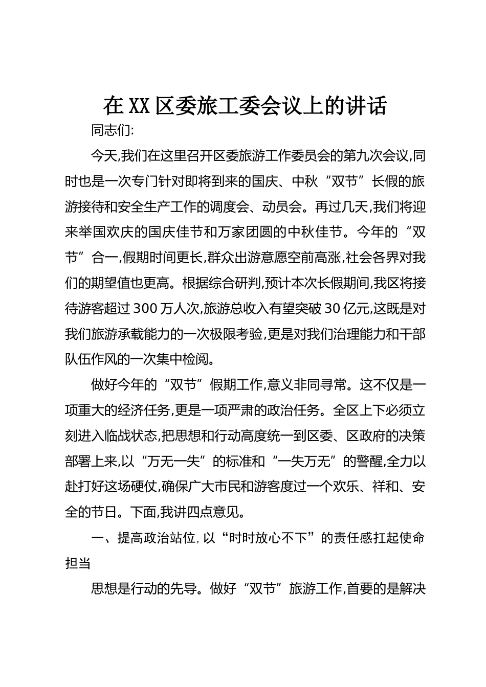在XX區(qū)委旅工委會(huì)議上的講話同志們:今天,我們?cè)谶@里召開區(qū)委旅游工作委員會(huì)的第九次會(huì)議,同時(shí)也是一次專門針對(duì)即將到來的國(guó)慶、中秋“雙節(jié)”長(zhǎng)假的旅游接待和安全生產(chǎn)工作的調(diào)度會(huì)、動(dòng)員會(huì)。再過幾天,我們將迎來舉國(guó)歡慶的國(guó)慶佳節(jié)和萬家團(tuán)圓的中秋佳節(jié)。今年的“雙節(jié)”合一,假期時(shí)間更長(zhǎng),群眾出游意愿空前高漲,社會(huì)各界對(duì)我們的期望值也更高。根據(jù)綜合研判,預(yù)計(jì)本次長(zhǎng)假期間,我區(qū)將接待游客超過300萬人次,旅游總收入有望突破30億元,這既是對(duì)我們旅游承載能力的一次極限考驗(yàn),更是對(duì)我們治理能力和干部隊(duì)伍作風(fēng)的一次集中檢閱。做好今年的“雙節(jié)”假期工作,意義非同尋常。...