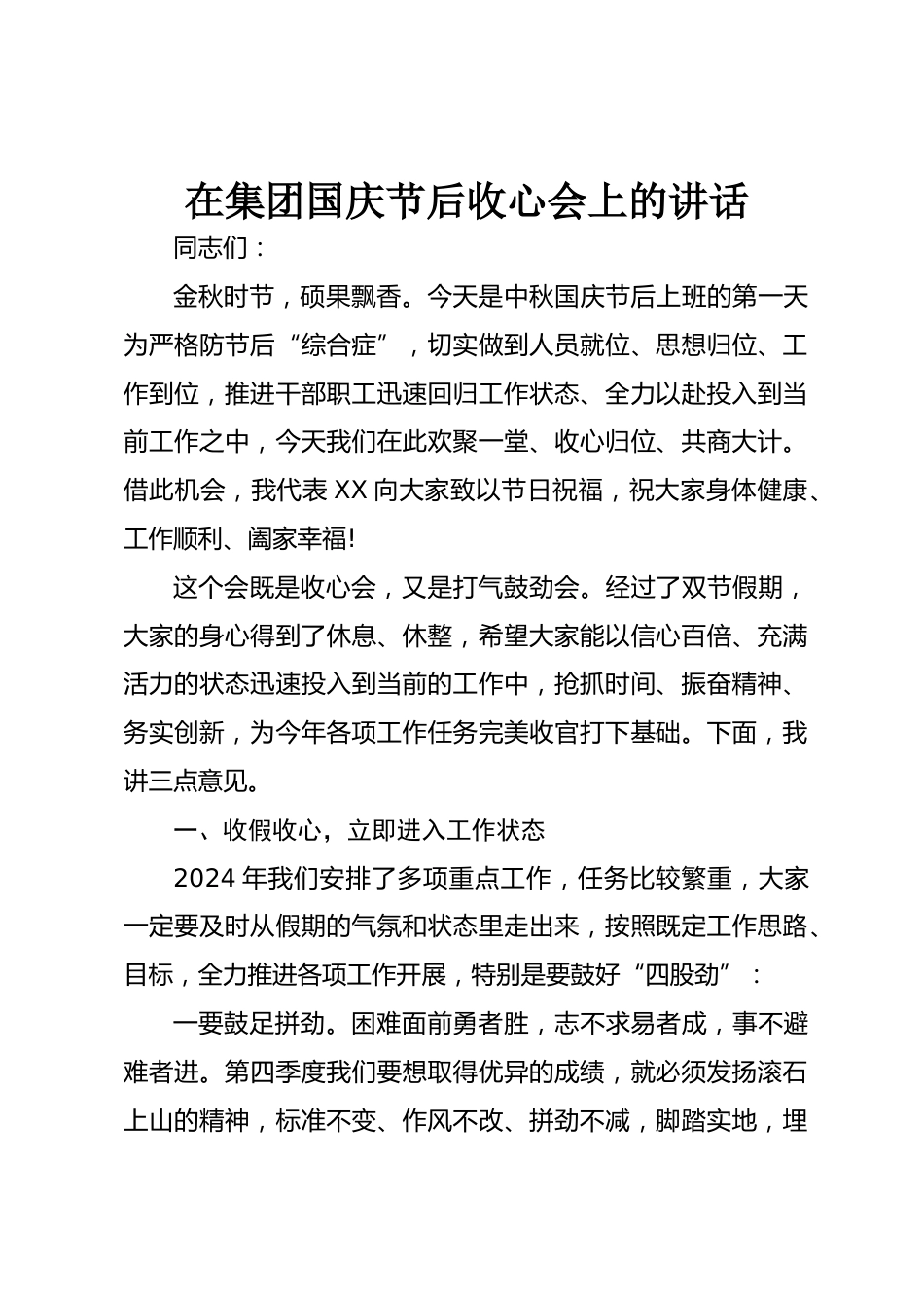 在集團國慶節(jié)后收心會上的講話同志們:金秋時節(jié),碩果飄香。今天是中秋國慶節(jié)后上班的第一天為嚴格防節(jié)后“綜合癥”,切實做到人員就位、思想歸位、工作到位,推進干部職工迅速回歸工作狀態(tài)、全力以赴投入到當(dāng)前工作之中,今天我們在此歡聚一堂、收心歸位、共商大計。借此機會,我代表XX向大家致以節(jié)日祝福,祝大家身體健康、工作順利、闔家幸福!這個會既是收心會,又是打氣鼓勁會。經(jīng)過了雙節(jié)假期,大家的身心得到了休息、休整,希望大家能以信心百倍、充滿活力的狀態(tài)迅速投入到當(dāng)前的工作中,搶抓時間、振奮精神、務(wù)實創(chuàng)新,為今年各項工作任務(wù)完美收官打下基礎(chǔ)。下面...