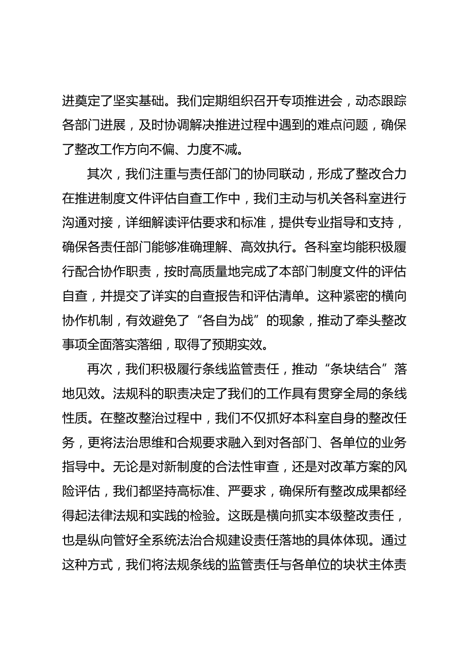 法規(guī)科關(guān)于落實深化整改整治工作的分析報告(精品)根據(jù)市局(公司)《關(guān)于開展深化整改整治工作“回頭看”的通知》的統(tǒng)一部署和要求,法規(guī)科高度重視,迅速行動,緊密圍繞“三看三查”的核心內(nèi)容,對本科室牽頭及參與的整改整治任務(wù)進行了全面、系統(tǒng)、深入的“回頭看”檢視。我們堅持問題導(dǎo)向、目標導(dǎo)向和結(jié)果導(dǎo)向,充分運用“五個視角”對工作進展、整改成效及存在問題進行了綜合研判和客觀評估。現(xiàn)將相關(guān)情況報告如下:一、責任落實方面在本次深化整改整治工作中,法規(guī)科堅決貫徹市局(公司)黨組的決策部署,將扛穩(wěn)抓實政治責任作為首要任務(wù),確保履職盡責堅決到位。...