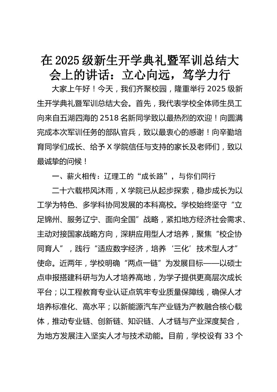 在2025級(jí)新生開(kāi)學(xué)典禮暨軍訓(xùn)總結(jié)大會(huì)上的講話:立心向遠(yuǎn),篤學(xué)力行大家上午好!今天,我們齊聚校園,隆重舉行2025級(jí)新生開(kāi)學(xué)典禮暨軍訓(xùn)總結(jié)大會(huì)。首先,我代表學(xué)校全體師生員工向來(lái)自五湖四海的2518名新同學(xué)致以最熱烈的歡迎!向圓滿完成本次軍訓(xùn)任務(wù)的部隊(duì)官兵,致以最衷心的感謝!向辛勤培育同學(xué)們成長(zhǎng)、給予X學(xué)院信任與支持的家長(zhǎng)及老師們,致以最誠(chéng)摯的問(wèn)候!一、薪火相傳:遼理工的“成長(zhǎng)路”,與你們同行二十六載櫛風(fēng)沐雨,X學(xué)院已從起步探索,穩(wěn)步成長(zhǎng)為以工學(xué)為特色、多學(xué)科協(xié)同發(fā)展的本科高校。學(xué)校始終堅(jiān)守“立足錦州、服務(wù)遼寧、面向全國(guó)”戰(zhàn)略,緊扣地方經(jīng)濟(jì)...