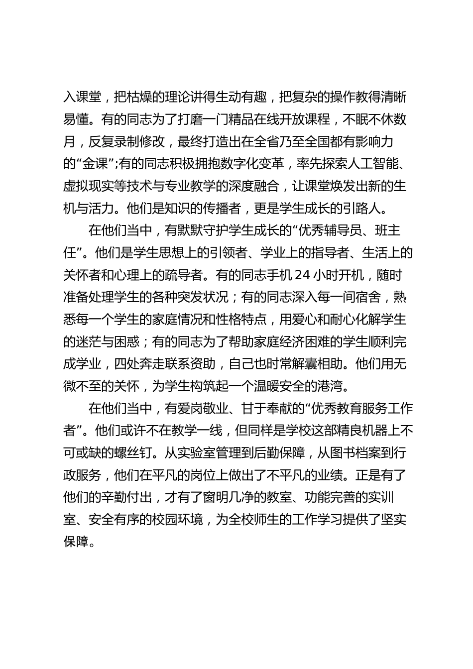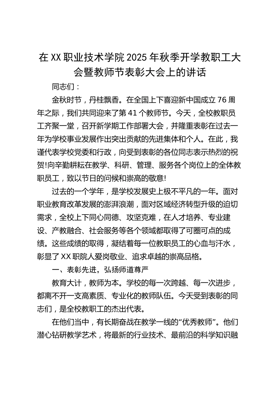 在XX職業(yè)技術學院2025年秋季開學教職工大會暨教師節(jié)表彰大會上的講話同志們:金秋時節(jié),丹桂飄香。在全國上下喜迎新中國成立76周年之際,我們共同迎來了第41個教師節(jié)。今天,全校教職員工齊聚一堂,召開新學期工作部署大會,并隆重表彰在過去一年為學校事業(yè)發(fā)展作出突出貢獻的先進集體和個人。在此,我謹代表學校黨委和行政,向受到表彰的各位同志表示熱烈的祝賀!向辛勤耕耘在教學、科研、管理、服務各個崗位上的全體教職員工,致以節(jié)日的問候和崇高的敬意!過去的一個學年,是學校發(fā)展史上極不平凡的一年。面對職業(yè)教育改革發(fā)展的澎湃浪潮,面對區(qū)域經濟轉型升級的迫切需...