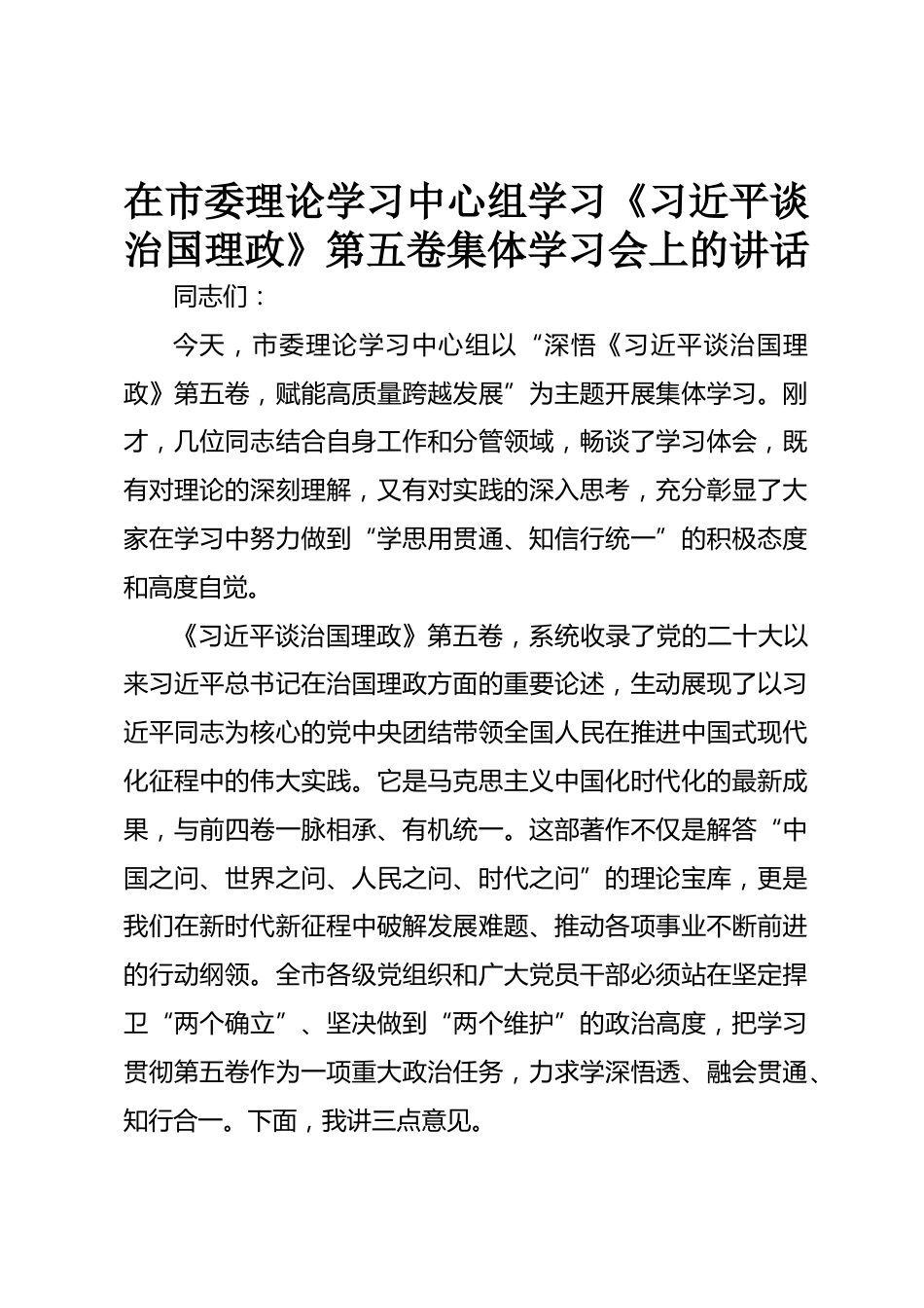在市委理論學(xué)習(xí)中心組學(xué)習(xí)《習(xí)近平談治國(guó)理政》第五卷集體學(xué)習(xí)會(huì)上的講話同志們:今天,市委理論學(xué)習(xí)中心組以“深悟《習(xí)近平談治國(guó)理政》第五卷,賦能高質(zhì)量跨越發(fā)展”為主題開展集體學(xué)習(xí)。剛才,幾位同志結(jié)合自身工作和分管領(lǐng)域,暢談了學(xué)習(xí)體會(huì),既有對(duì)理論的深刻理解,又有對(duì)實(shí)踐的深入思考,充分彰顯了大家在學(xué)習(xí)中努力做到“學(xué)思用貫通、知信行統(tǒng)一”的積極態(tài)度和高度自覺。《習(xí)近平談治國(guó)理政》第五卷,系統(tǒng)收錄了黨的二十大以來(lái)習(xí)近平總書記在治國(guó)理政方面的重要論述,生動(dòng)展現(xiàn)了以習(xí)近平同志為核心的黨中央團(tuán)結(jié)帶領(lǐng)全國(guó)人民在推進(jìn)中國(guó)式現(xiàn)代化征程中的偉大實(shí)踐。...