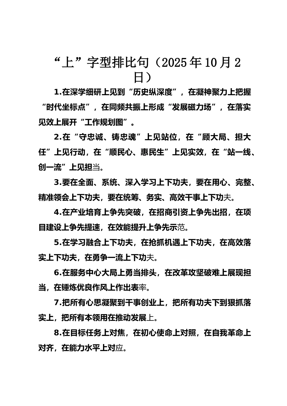 “上”字型排比句(2025年10月2日)1.在深學細研上見到“歷史縱深度”,在凝神聚力上把握“時代坐標點”,在同頻共振上形成“發(fā)展磁力場”,在落實見效上展開“工作規(guī)劃圖”。2.在“守忠誠、鑄忠魂”上見站位,在“顧大局、擔大任”上見行動,在“順民心、惠民生”上見實效,在“站一線、創(chuàng)一流”上見擔當。3.要在全面、系統(tǒng)、深入學習上下功夫,要在用心、完整、精準領會上下功夫,要在統(tǒng)籌、務實、高效干事上下功夫。4.在產業(yè)培育上爭先突破,在招商引資上爭先出招,在項目建設上爭先提速,在效能提升上爭先示范。5.在學習融合上下功夫,在搶抓機遇上下功夫,在高效落...