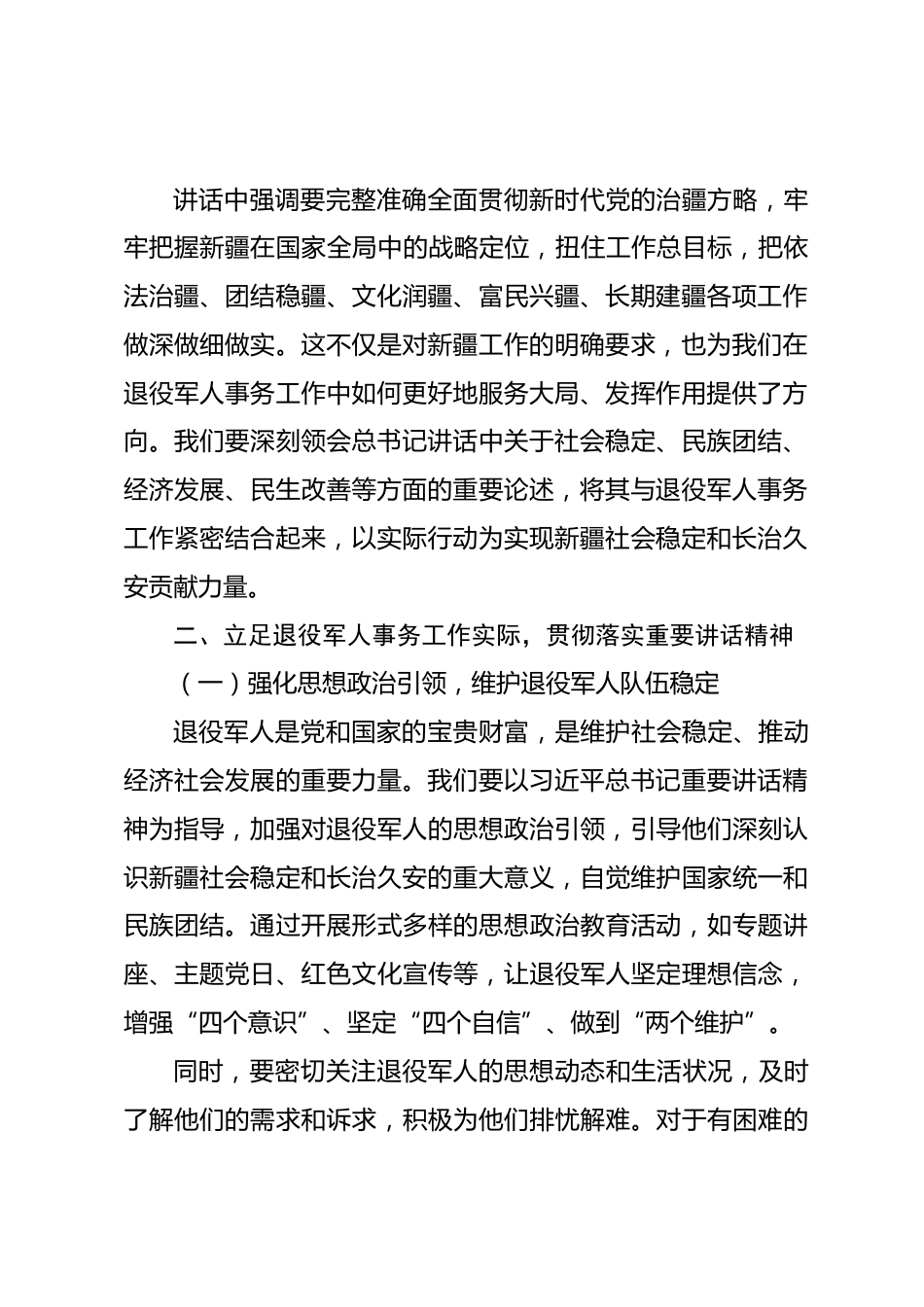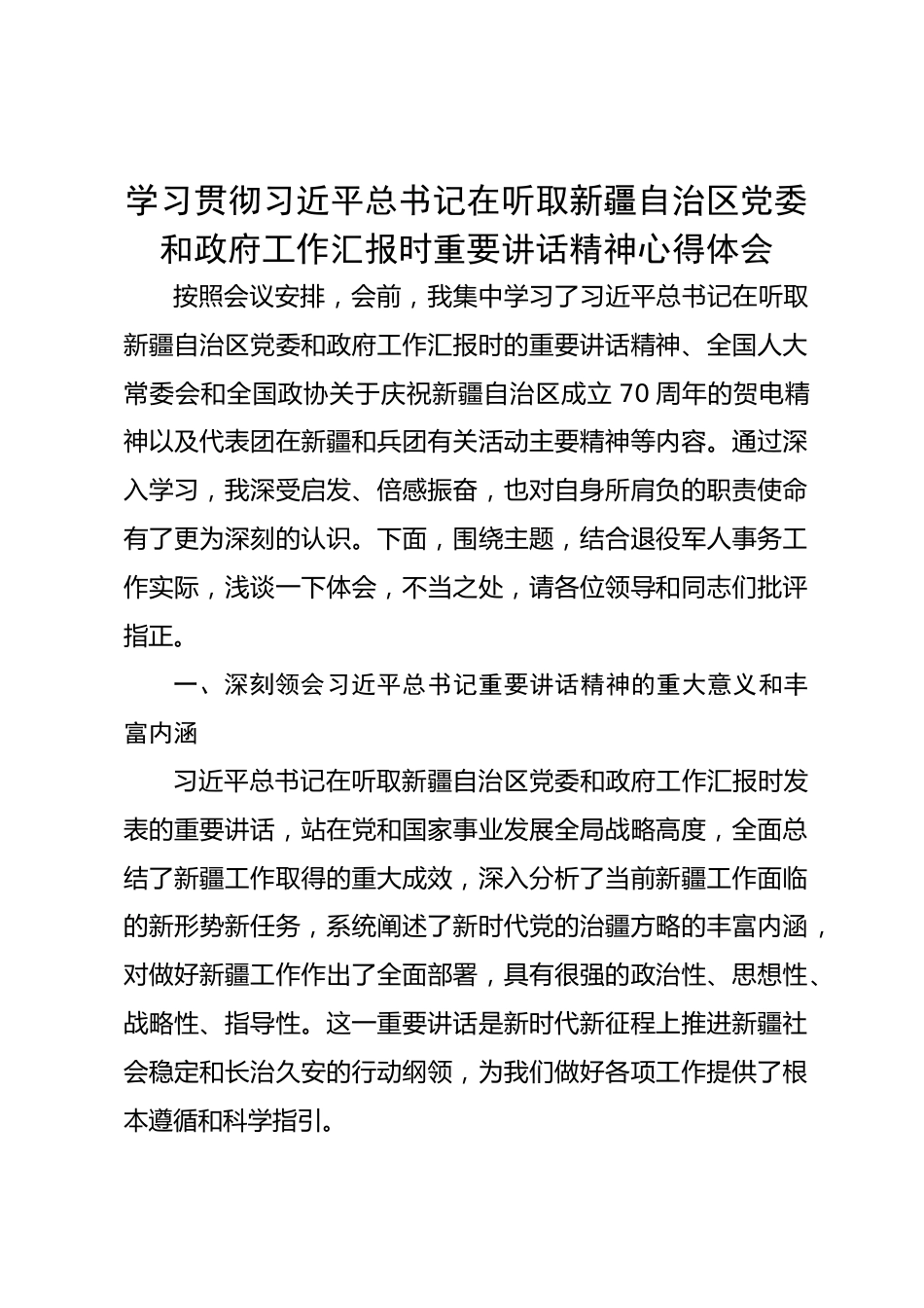 學習貫徹習近平總書記在聽取新疆自治區(qū)黨委和政府工作匯報時重要講話精神心得體會按照會議安排,會前,我集中學習了習近平總書記在聽取新疆自治區(qū)黨委和政府工作匯報時的重要講話精神、全國人大常委會和全國政協(xié)關于慶祝新疆自治區(qū)成立70周年的賀電精神以及代表團在新疆和兵團有關活動主要精神等內容。通過深入學習,我深受啟發(fā)、倍感振奮,也對自身所肩負的職責使命有了更為深刻的認識。下面,圍繞主題,結合退役軍人事務工作實際,淺談一下體會,不當之處,請各位領導和同志們批評指正。一、深刻領會習近平總書記重要講話精神的重大意義和豐富內涵習近平總書記在聽取新...