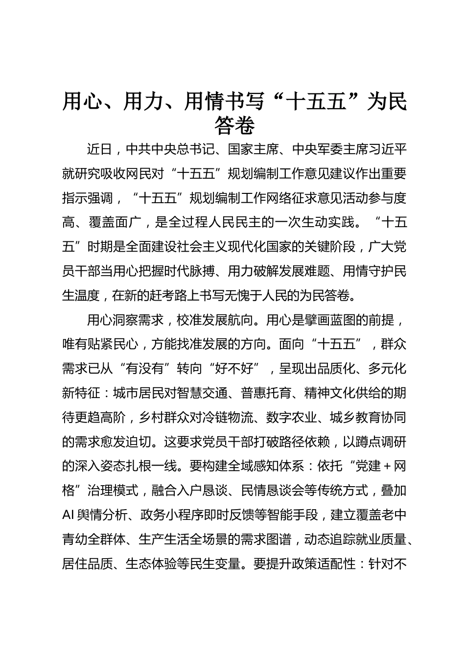 用心、用力、用情書寫“十五五”為民答卷近日,中共中央總書記、國(guó)家主席、中央軍委主席習(xí)近平就研究吸收網(wǎng)民對(duì)“十五五”規(guī)劃編制工作意見建議作出重要指示強(qiáng)調(diào),“十五五”規(guī)劃編制工作網(wǎng)絡(luò)征求意見活動(dòng)參與度高、覆蓋面廣,是全過程人民民主的一次生動(dòng)實(shí)踐?!笆逦濉睍r(shí)期是全面建設(shè)社會(huì)主義現(xiàn)代化國(guó)家的關(guān)鍵階段,廣大黨員干部當(dāng)用心把握時(shí)代脈搏、用力破解發(fā)展難題、用情守護(hù)民生溫度,在新的趕考路上書寫無愧于人民的為民答卷。用心洞察需求,校準(zhǔn)發(fā)展航向。用心是擘畫藍(lán)圖的前提,唯有貼緊民心,方能找準(zhǔn)發(fā)展的方向。面向“十五五”,群眾需求已從“有沒有”轉(zhuǎn)向...