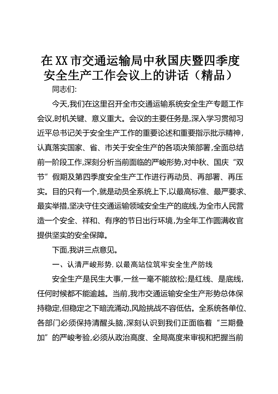 在XX市交通運輸局中秋國慶暨四季度安全生產(chǎn)工作會議上的講話(精品)