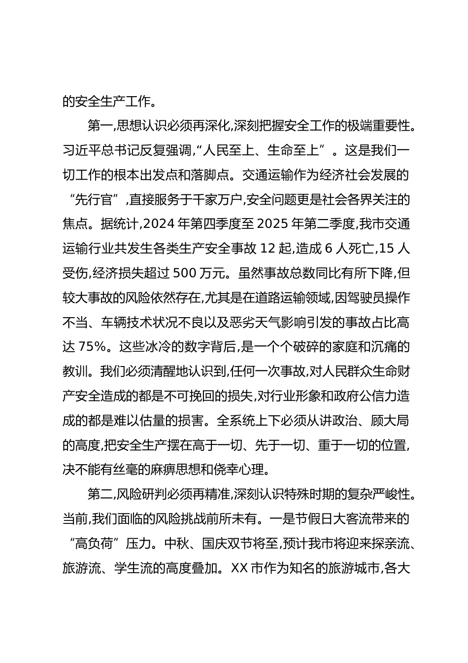 在XX市交通運輸局中秋國慶暨四季度安全生產(chǎn)工作會議上的講話(精品)同志們:今天,我們在這里召開全市交通運輸系統(tǒng)安全生產(chǎn)專題工作會議,時機關(guān)鍵、意義重大。會議的主要任務是,深入學習貫徹習近平總書記關(guān)于安全生產(chǎn)工作的重要論述和重要指示批示精神,認真落實國家、省、市關(guān)于安全生產(chǎn)的各項決策部署,全面總結(jié)前一階段工作,深刻分析當前面臨的嚴峻形勢,對中秋、國慶“雙節(jié)”假期及第四季度安全生產(chǎn)工作進行再動員、再部署、再壓實。目的只有一個,就是動員全系統(tǒng)上下,以最高標準、最嚴要求、最實舉措,堅決守住交通運輸領(lǐng)域安全生產(chǎn)的底線,為全市人民營造一個安全、祥和、...