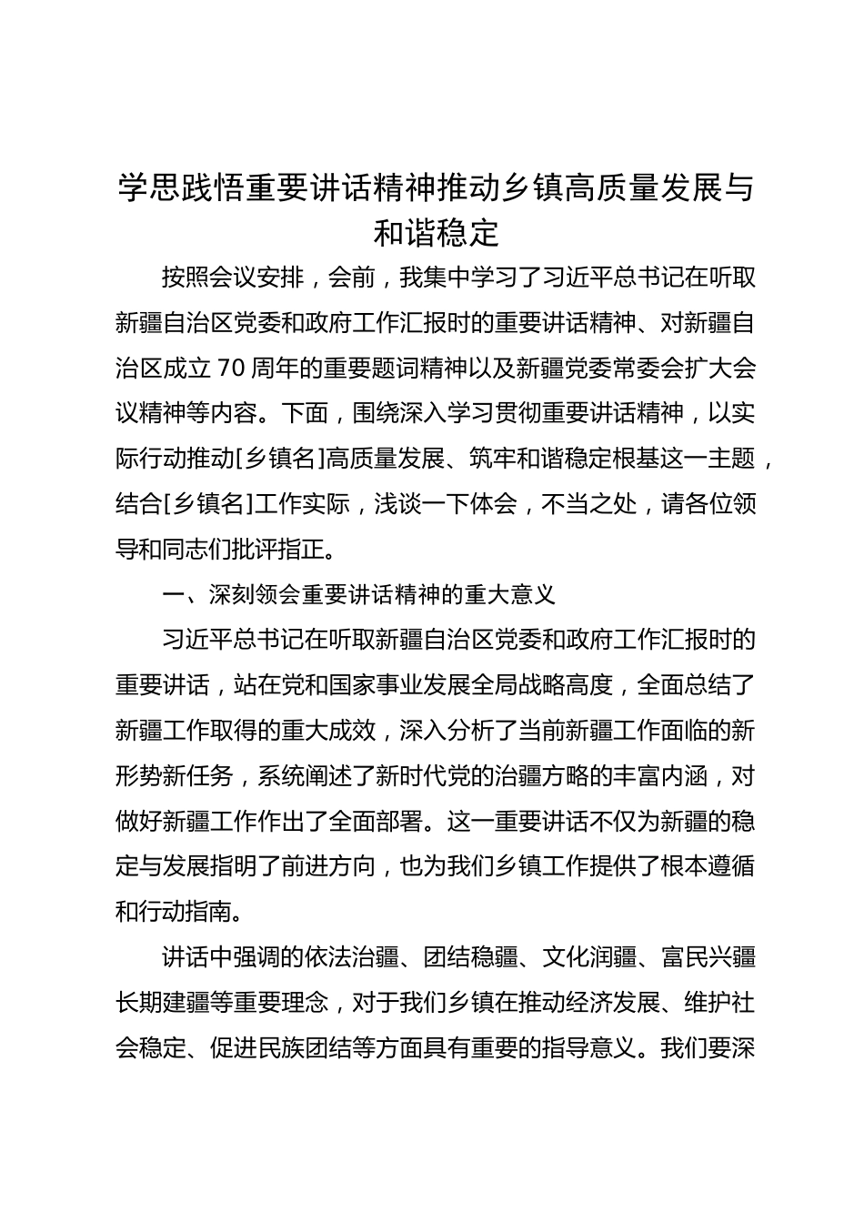 學(xué)思踐悟重要講話精神推動(dòng)鄉(xiāng)鎮(zhèn)高質(zhì)量發(fā)展與和諧穩(wěn)定按照會(huì)議安排,會(huì)前,我集中學(xué)習(xí)了習(xí)近平總書記在聽取新疆自治區(qū)黨委和政府工作匯報(bào)時(shí)的重要講話精神、對(duì)新疆自治區(qū)成立70周年的重要題詞精神以及新疆黨委常委會(huì)擴(kuò)大會(huì)議精神等內(nèi)容。下面,圍繞深入學(xué)習(xí)貫徹重要講話精神,以實(shí)際行動(dòng)推動(dòng)[鄉(xiāng)鎮(zhèn)名]高質(zhì)量發(fā)展、筑牢和諧穩(wěn)定根基這一主題,結(jié)合[鄉(xiāng)鎮(zhèn)名]工作實(shí)際,淺談一下體會(huì),不當(dāng)之處,請(qǐng)各位領(lǐng)導(dǎo)和同志們批評(píng)指正。一、深刻領(lǐng)會(huì)重要講話精神的重大意義習(xí)近平總書記在聽取新疆自治區(qū)黨委和政府工作匯報(bào)時(shí)的重要講話,站在黨和國(guó)家事業(yè)發(fā)展全局戰(zhàn)略高度,全面總結(jié)了新疆...