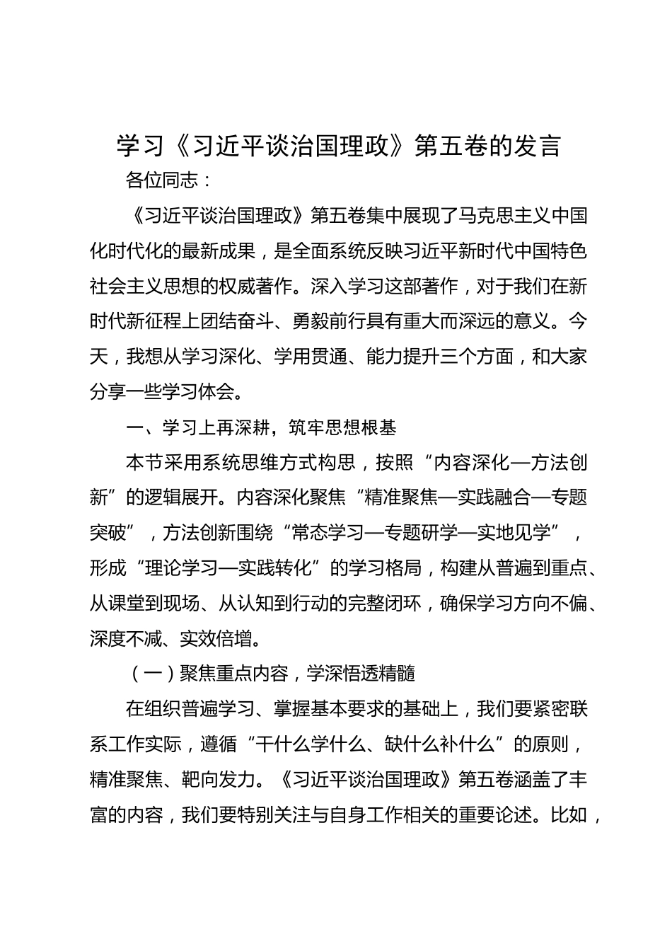 學(xué)習(xí)《習(xí)近平談治國理政》第五卷的發(fā)言各位同志:《習(xí)近平談治國理政》第五卷集中展現(xiàn)了馬克思主義中國化時代化的最新成果,是全面系統(tǒng)反映習(xí)近平新時代中國特色社會主義思想的權(quán)威著作。深入學(xué)習(xí)這部著作,對于我們在新時代新征程上團(tuán)結(jié)奮斗、勇毅前行具有重大而深遠(yuǎn)的意義。今天,我想從學(xué)習(xí)深化、學(xué)用貫通、能力提升三個方面,和大家分享一些學(xué)習(xí)體會。一、學(xué)習(xí)上再深耕,筑牢思想根基本節(jié)采用系統(tǒng)思維方式構(gòu)思,按照“內(nèi)容深化—方法創(chuàng)新”的邏輯展開。內(nèi)容深化聚焦“精準(zhǔn)聚焦—實(shí)踐融合—專題突破”,方法創(chuàng)新圍繞“常態(tài)學(xué)習(xí)—專題研學(xué)—實(shí)地見學(xué)”,形成“理論學(xué)習(xí)...