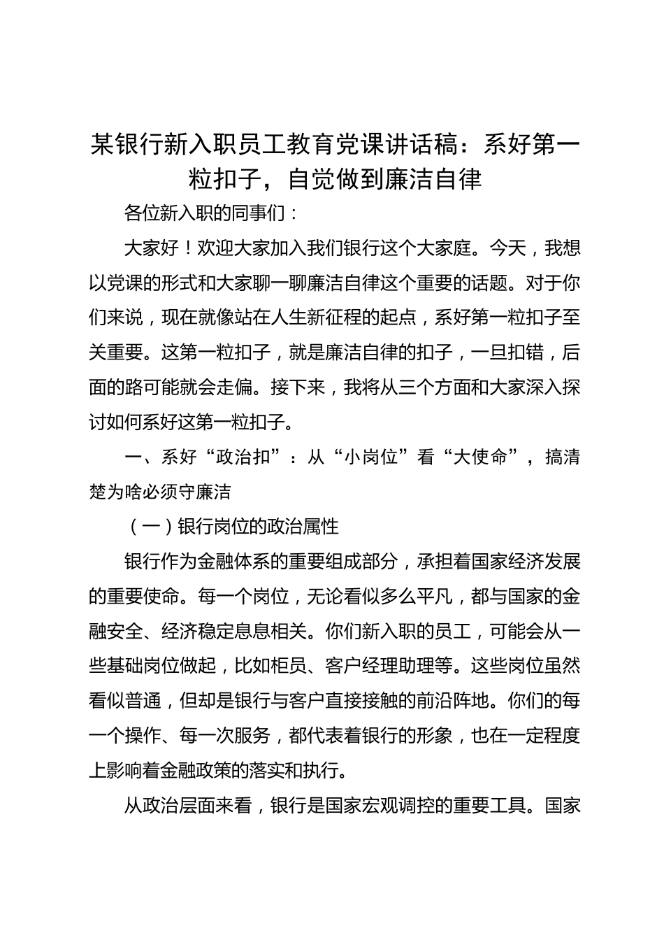 某銀行新入職員工教育黨課講話稿:系好第一粒扣子,自覺做到廉潔自律