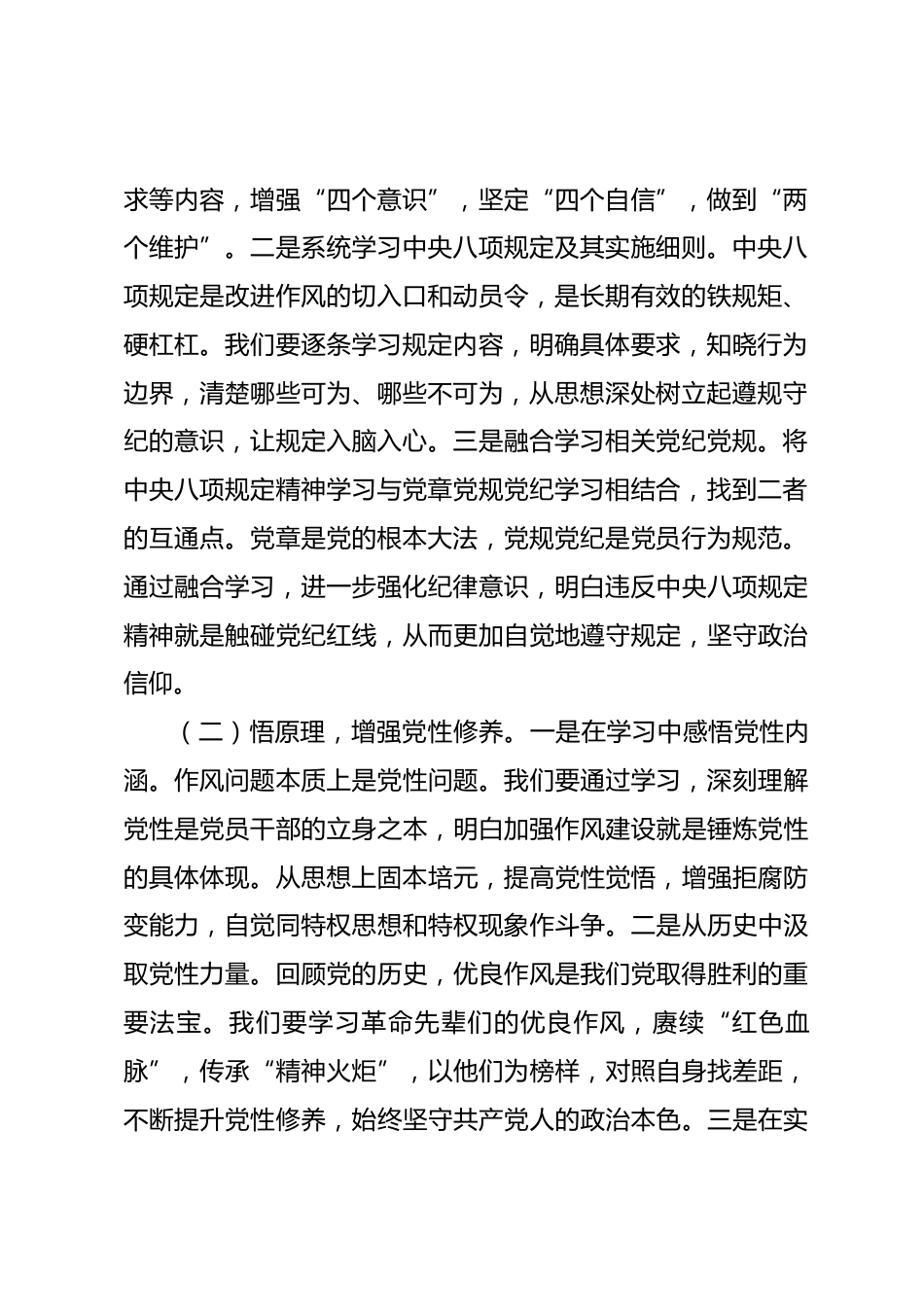 交流發(fā)言:堅持學查改結合,筑牢專題根基開展深入貫徹中央八項規(guī)定精神學習教育,是鞏固深化主題教育和黨紀學習教育成果的關鍵舉措,是縱深推進全面從嚴治黨的重要內容。這不僅有助于密切黨群干群關系、鞏固黨的執(zhí)政基礎,更是推進中國式現代化的有力保障。我們必須以高度的政治自覺和行動自覺,一體推進“學、查、改”,將作風建設融入日常工作,確保學習教育取得實效,為黨和國家事業(yè)發(fā)展提供堅實作風保障。一、深學細悟強根基,以忠誠擔當踐行初心使命深入貫徹中央八項規(guī)定精神,首先要在“學”上下功夫。只有通過深學細悟,才能準確把握其精神實質和內涵要求,以政治...