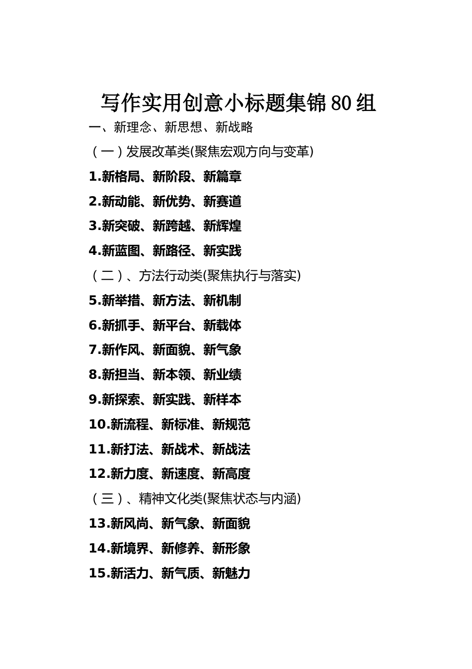 寫(xiě)作實(shí)用創(chuàng)意小標(biāo)題集錦80組一、新理念、新思想、新戰(zhàn)略(一)發(fā)展改革類(lèi)(聚焦宏觀(guān)方向與變革)1.新格局、新階段、新篇章2.新動(dòng)能、新優(yōu)勢(shì)、新賽道3.新突破、新跨越、新輝煌4.新藍(lán)圖、新路徑、新實(shí)踐(二)、方法行動(dòng)類(lèi)(聚焦執(zhí)行與落實(shí))5.新舉措、新方法、新機(jī)制6.新抓手、新平臺(tái)、新載體7.新作風(fēng)、新面貌、新氣象8.新?lián)?dāng)、新本領(lǐng)、新業(yè)績(jī)9.新探索、新實(shí)踐、新樣本10.新流程、新標(biāo)準(zhǔn)、新規(guī)范11.新打法、新戰(zhàn)術(shù)、新戰(zhàn)法12.新力度、新速度、新高度(三)、精神文化類(lèi)(聚焦?fàn)顟B(tài)與內(nèi)涵)13.新風(fēng)尚、新氣象、新面貌14.新境界、新修養(yǎng)、新形象15.新活力、新氣質(zhì)、新魅力16.新自...