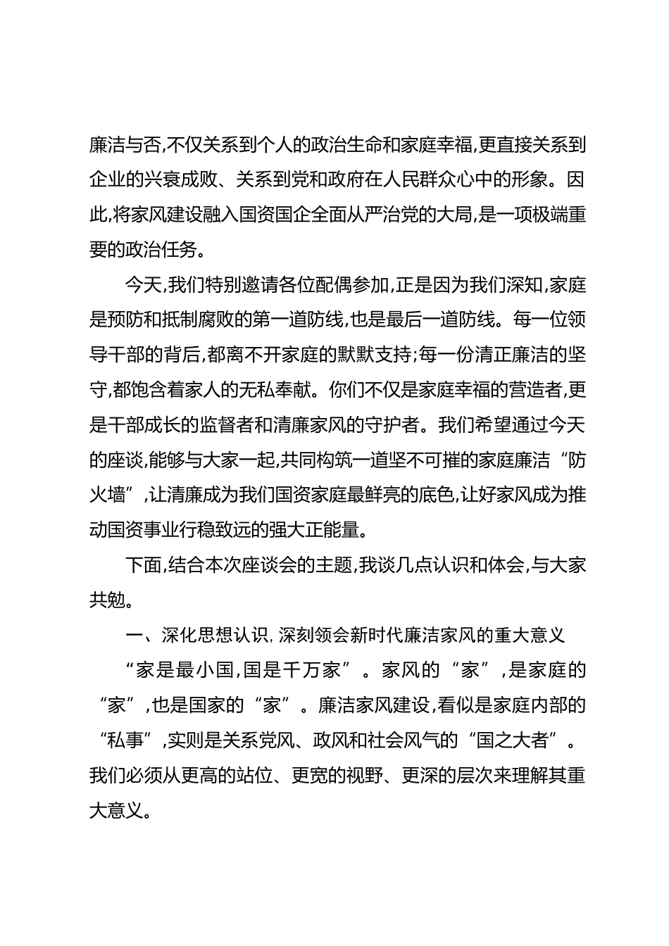 在XX市國資系統(tǒng)領(lǐng)導(dǎo)干部配偶廉潔家風(fēng)座談會上的講話尊敬的各位來賓,同志們,朋友們:大家上午好!今天,我們懷著一份特殊的敬意和誠摯的期盼,在這里召開XX市國資系統(tǒng)領(lǐng)導(dǎo)干部配偶廉潔家風(fēng)座談會。首先,我代表XX市國資委黨委,向在座的各位來賓——我們國資系統(tǒng)領(lǐng)導(dǎo)干部的“賢內(nèi)助”和“廉內(nèi)助”們,表示熱烈的歡迎!同時(shí),也借此機(jī)會,向你們長期以來對配偶工作的理解、對國資事業(yè)的支持以及為家庭付出的辛勞,致以最崇高的敬意和最衷心的感謝!我們今天相聚一堂,共同探討一個意義深遠(yuǎn)的話題——家庭、家教、家風(fēng)。這不僅是一次思想的交流、一次情感的溝通,更是一次責(zé)任的重申、一次...