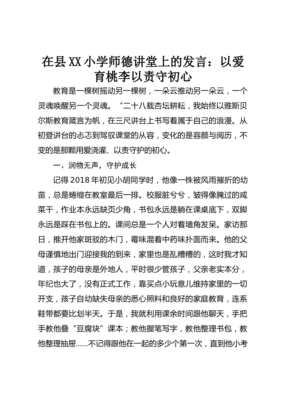 在縣XX小學(xué)師德講堂上的發(fā)言:以愛育桃李以責(zé)守初心