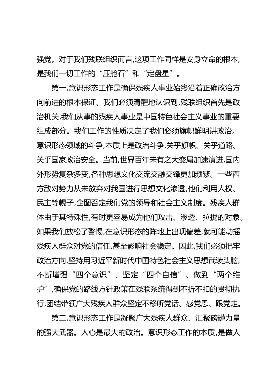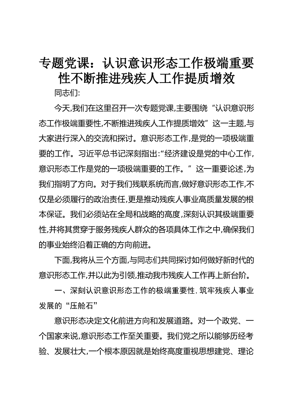 專題黨課:認識意識形態(tài)工作極端重要性不斷推進殘疾人工作提質(zhì)增效同志們:今天,我們在這里召開一次專題黨課,主要圍繞“認識意識形態(tài)工作極端重要性,不斷推進殘疾人工作提質(zhì)增效”這一主題,與大家進行深入的交流和探討。意識形態(tài)工作,是黨的一項極端重要的工作。習(xí)近平總書記深刻指出:“經(jīng)濟建設(shè)是黨的中心工作,意識形態(tài)工作是黨的一項極端重要的工作?!边@一重要論述,為我們指明了方向。對于我們殘聯(lián)系統(tǒng)而言,做好意識形態(tài)工作,不僅是必須履行的政治責(zé)任,更是推動殘疾人事業(yè)高質(zhì)量發(fā)展的根本保證。我們必須站在全局和戰(zhàn)略的高度,深刻認識其極端重要性,并將其貫穿于服務(wù)殘...