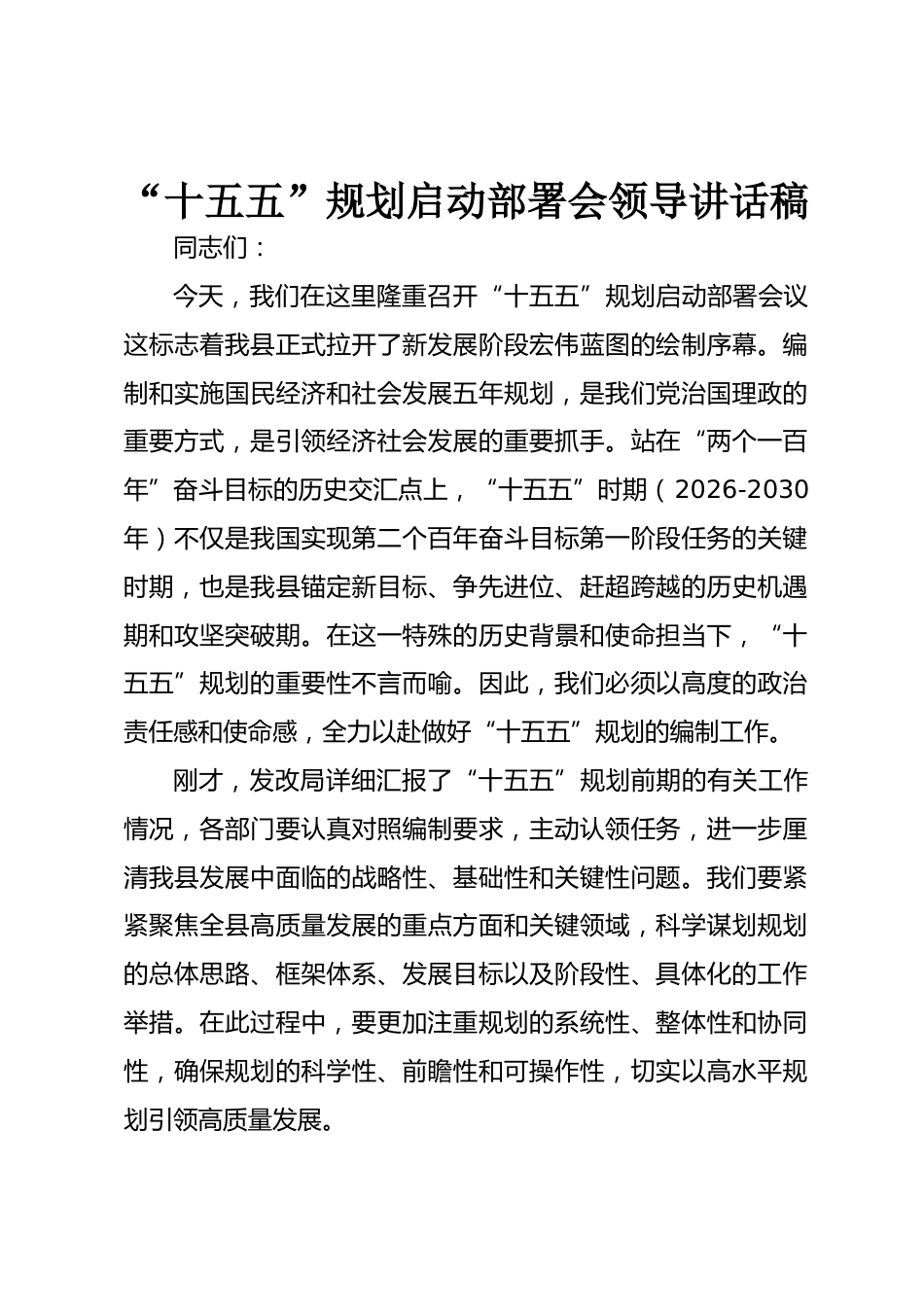 “十五五”規(guī)劃啟動(dòng)部署會(huì)領(lǐng)導(dǎo)講話稿同志們:今天,我們?cè)谶@里隆重召開(kāi)“十五五”規(guī)劃啟動(dòng)部署會(huì)議這標(biāo)志著我縣正式拉開(kāi)了新發(fā)展階段宏偉藍(lán)圖的繪制序幕。編制和實(shí)施國(guó)民經(jīng)濟(jì)和社會(huì)發(fā)展五年規(guī)劃,是我們黨治國(guó)理政的重要方式,是引領(lǐng)經(jīng)濟(jì)社會(huì)發(fā)展的重要抓手。站在“兩個(gè)一百年”奮斗目標(biāo)的歷史交匯點(diǎn)上,“十五五”時(shí)期(2026-2030年)不僅是我國(guó)實(shí)現(xiàn)第二個(gè)百年奮斗目標(biāo)第一階段任務(wù)的關(guān)鍵時(shí)期,也是我縣錨定新目標(biāo)、爭(zhēng)先進(jìn)位、趕超跨越的歷史機(jī)遇期和攻堅(jiān)突破期。在這一特殊的歷史背景和使命擔(dān)當(dāng)下,“十五五”規(guī)劃的重要性不言而喻。因此,我們必須以高度的政治責(zé)任感...