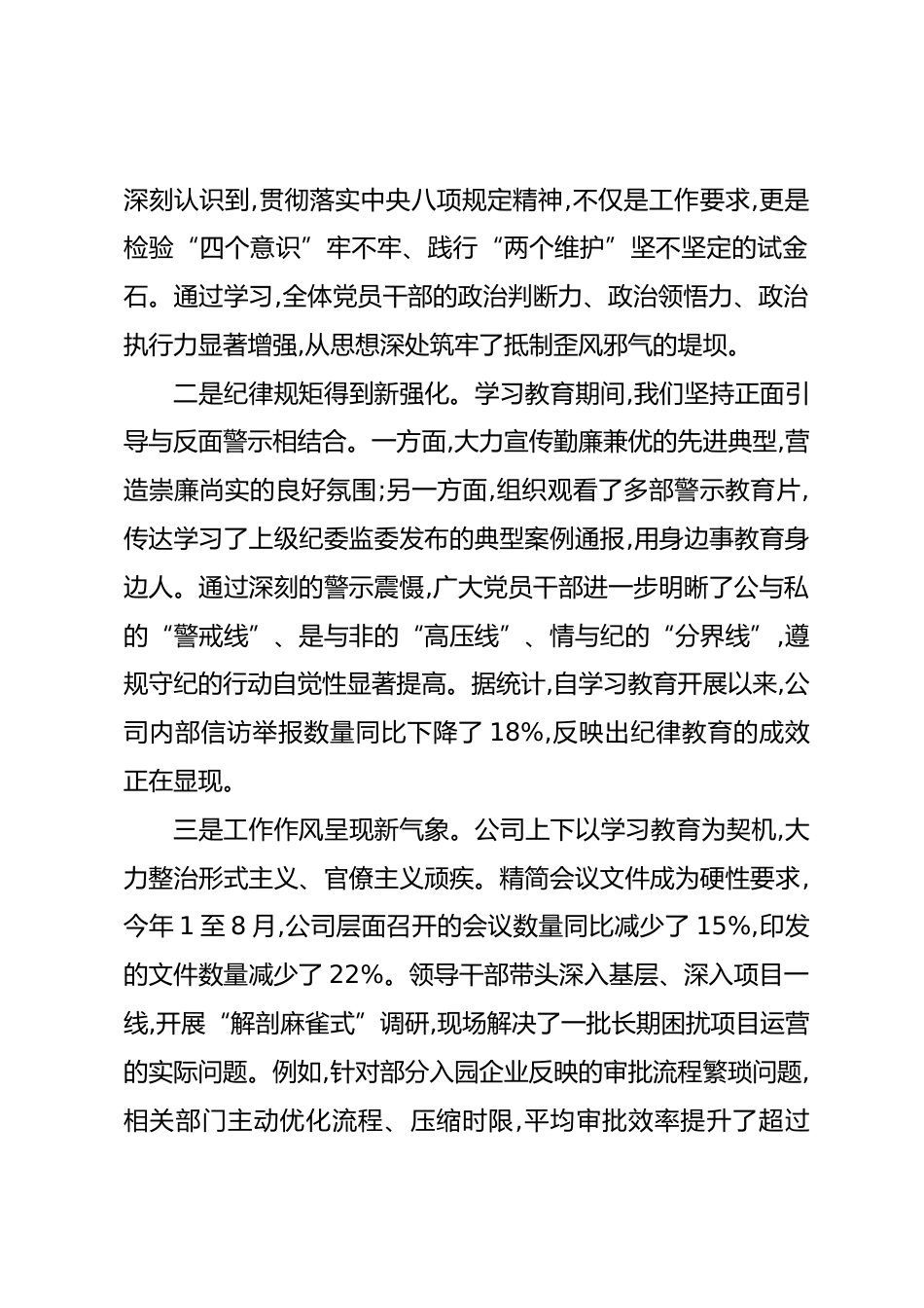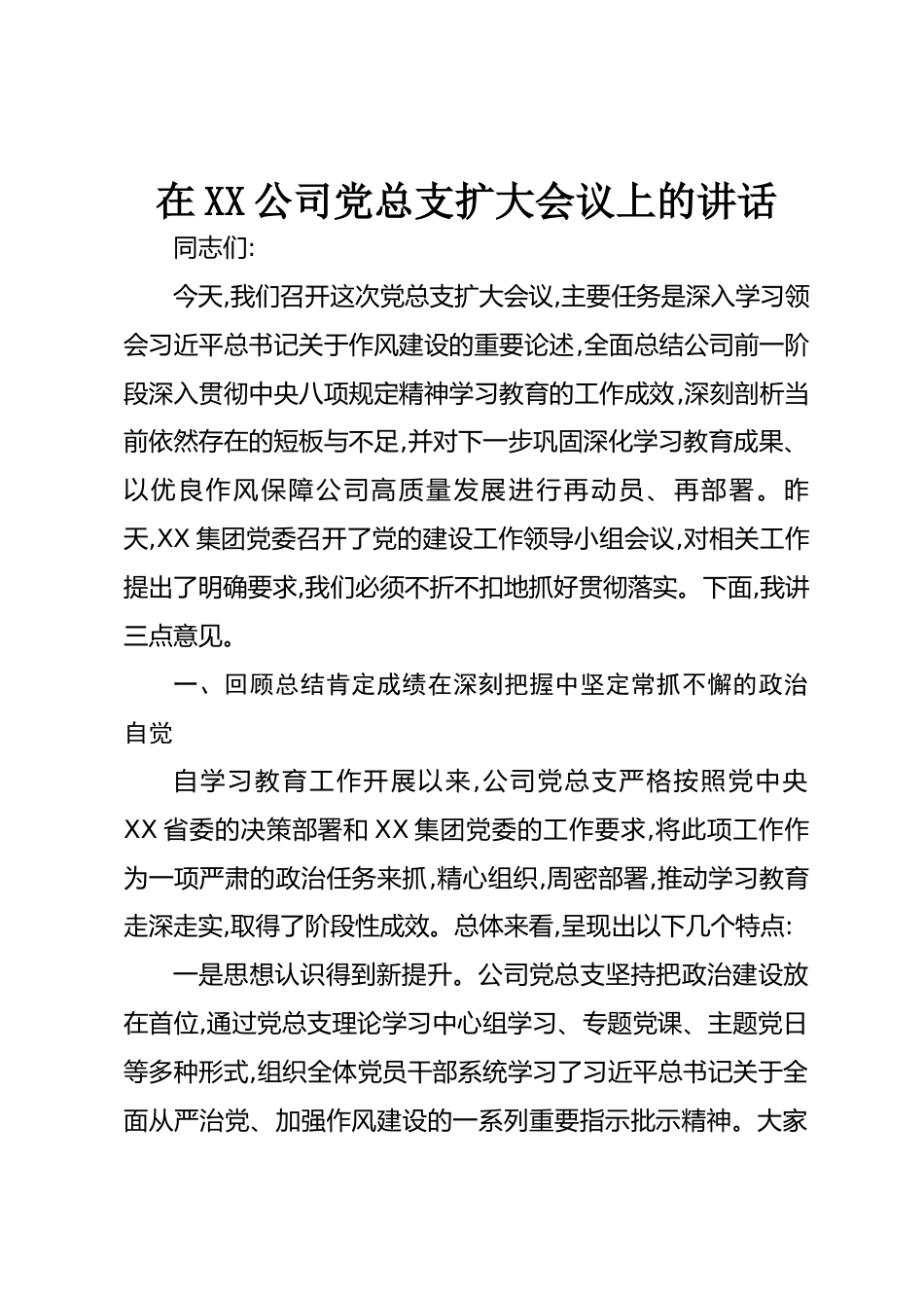 在XX公司黨總支擴大會議上的講話同志們:今天,我們召開這次黨總支擴大會議,主要任務(wù)是深入學(xué)習(xí)領(lǐng)會習(xí)近平總書記關(guān)于作風(fēng)建設(shè)的重要論述,全面總結(jié)公司前一階段深入貫徹中央八項規(guī)定精神學(xué)習(xí)教育的工作成效,深刻剖析當(dāng)前依然存在的短板與不足,并對下一步鞏固深化學(xué)習(xí)教育成果、以優(yōu)良作風(fēng)保障公司高質(zhì)量發(fā)展進行再動員、再部署。昨天,XX集團黨委召開了黨的建設(shè)工作領(lǐng)導(dǎo)小組會議,對相關(guān)工作提出了明確要求,我們必須不折不扣地抓好貫徹落實。下面,我講三點意見。一、回顧總結(jié)肯定成績在深刻把握中堅定常抓不懈的政治自覺自學(xué)習(xí)教育工作開展以來,公司黨總支嚴(yán)格按照黨中央XX省...