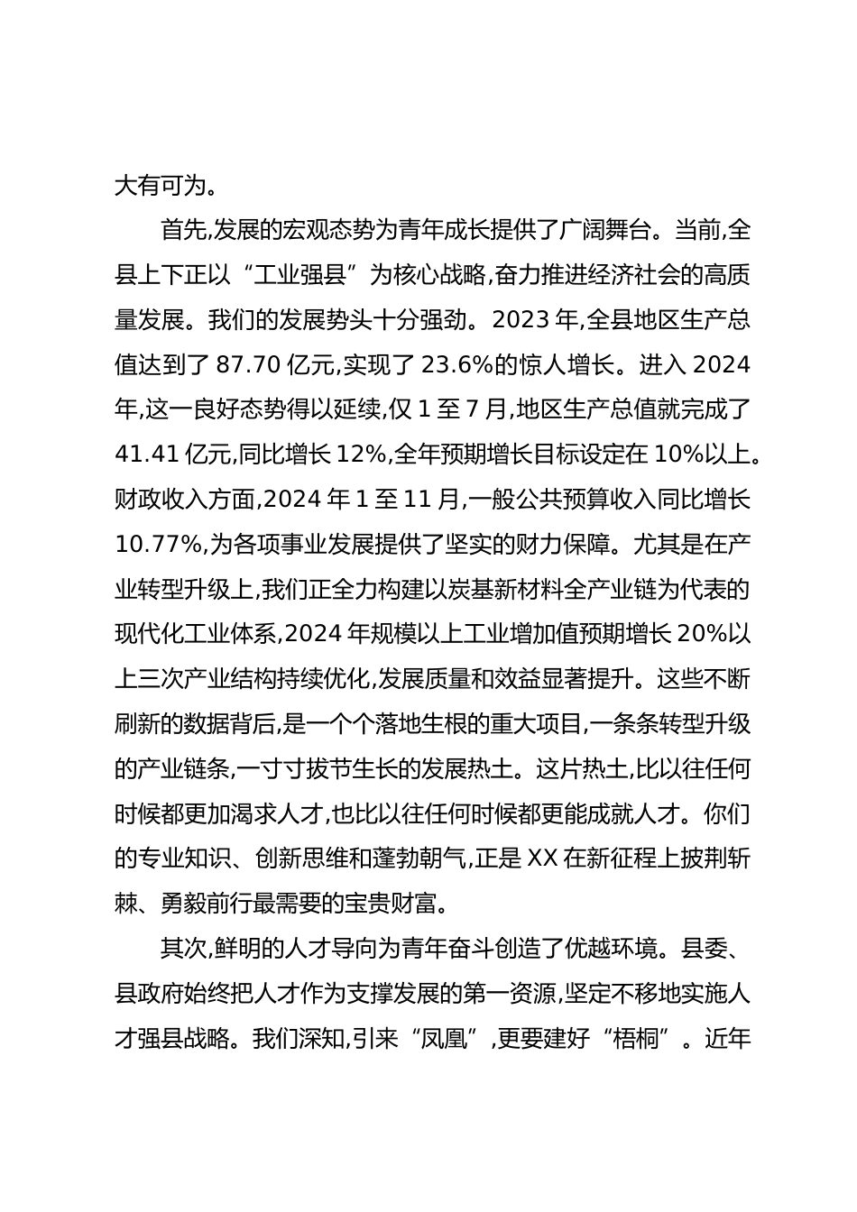 在XX縣年輕干部暨引進(jìn)人才座談會(huì)上的講話同志們,青年朋友們:大家下午好。今天,我們?cè)谶@里召開一個(gè)非常重要的會(huì)議,與各位年輕干部和引進(jìn)人才代表歡聚一堂,共話成長(zhǎng),共謀發(fā)展。剛才,幾位同志結(jié)合各自的崗位實(shí)際,分享了工作中的體會(huì)與感悟,提出了許多富有建設(shè)性的意見建議。大家的發(fā)言有思考、有銳氣、有情懷,充分展現(xiàn)了XX縣年輕一代昂揚(yáng)向上、奮發(fā)有為的精神風(fēng)貌,讓人深感欣慰,也對(duì)XX的未來更加充滿信心。召開這次座談會(huì),目的非常明確,就是要深入學(xué)習(xí)貫徹新時(shí)代黨的組織路線和人才工作新理念新戰(zhàn)略新舉措,進(jìn)一步加強(qiáng)與大家的溝通聯(lián)系,為大家加油鼓勁、搭臺(tái)撐腰,引導(dǎo)和激勵(lì)...