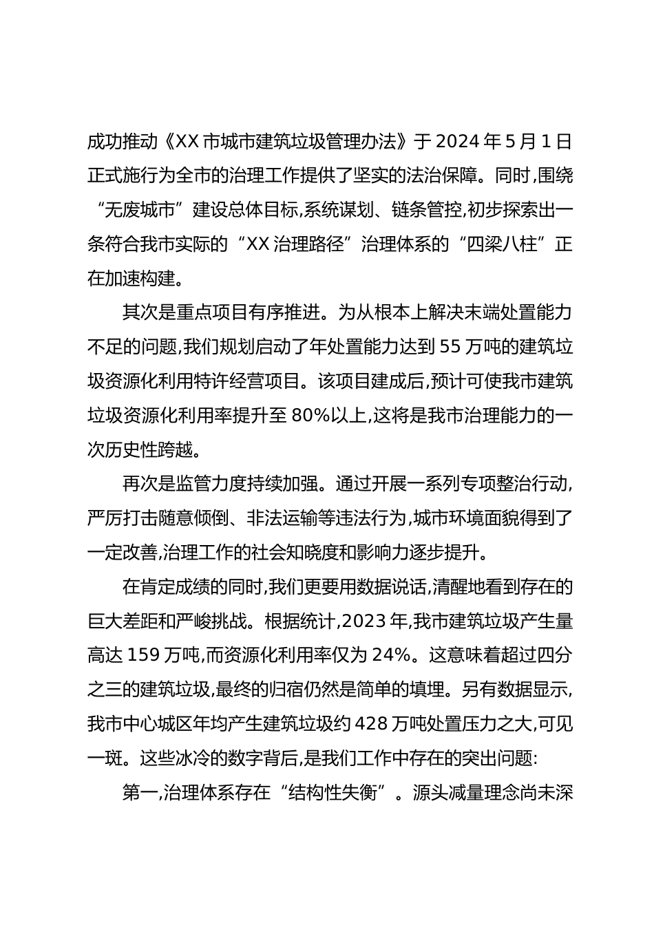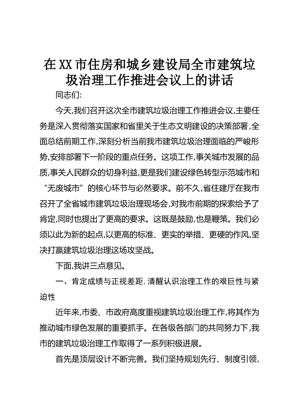 在XX市住房和城鄉(xiāng)建設局全市建筑垃圾治理工作推進會議上的講話同志們:今天,我們召開這次全市建筑垃圾治理工作推進會議,主要任務是深入貫徹落實國家和省里關于生態(tài)文明建設的決策部署,全面總結(jié)前期工作,深刻分析當前我市建筑垃圾治理面臨的嚴峻形勢,安排部署下一階段的重點任務。這項工作,事關城市發(fā)展的品質(zhì),事關人民群眾的切身利益,更是我們建設綠色轉(zhuǎn)型示范城市和“無廢城市”的核心環(huán)節(jié)與必然要求。前不久,省住建廳在我市召開了全省城市建筑垃圾治理現(xiàn)場會,對我市前期的探索給予了肯定,同時也提出了更高的要求。這既是鼓勵,也是鞭策。我們必須以此為新的起點,以更高的...