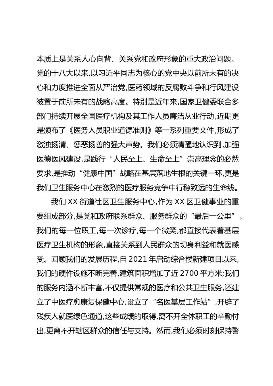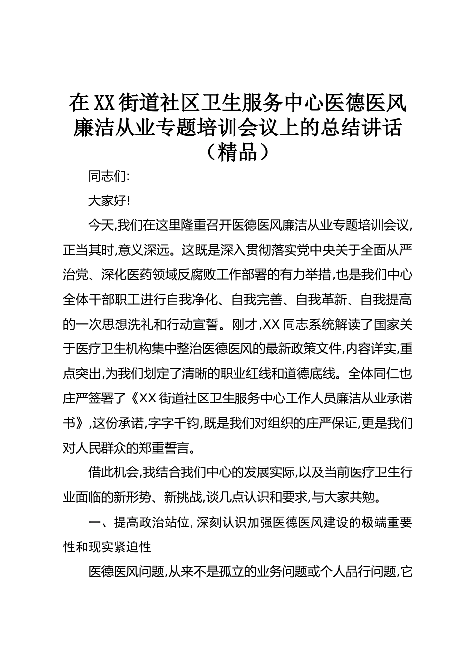 在XX街道社區(qū)衛(wèi)生服務(wù)中心醫(yī)德醫(yī)風(fēng)廉潔從業(yè)專題培訓(xùn)會議上的總結(jié)講話(精品)同志們:大家好!今天,我們在這里隆重召開醫(yī)德醫(yī)風(fēng)廉潔從業(yè)專題培訓(xùn)會議,正當(dāng)其時(shí),意義深遠(yuǎn)。這既是深入貫徹落實(shí)黨中央關(guān)于全面從嚴(yán)治黨、深化醫(yī)藥領(lǐng)域反腐敗工作部署的有力舉措,也是我們中心全體干部職工進(jìn)行自我凈化、自我完善、自我革新、自我提高的一次思想洗禮和行動(dòng)宣誓。剛才,XX同志系統(tǒng)解讀了國家關(guān)于醫(yī)療衛(wèi)生機(jī)構(gòu)集中整治醫(yī)德醫(yī)風(fēng)的最新政策文件,內(nèi)容詳實(shí),重點(diǎn)突出,為我們劃定了清晰的職業(yè)紅線和道德底線。全體同仁也莊嚴(yán)簽署了《XX街道社區(qū)衛(wèi)生服務(wù)中心工作人員廉潔從業(yè)承諾書》,這份...