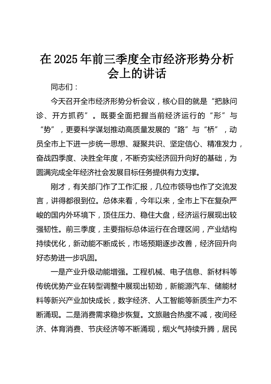 在2025年前三季度全市經(jīng)濟形勢分析會上的講話